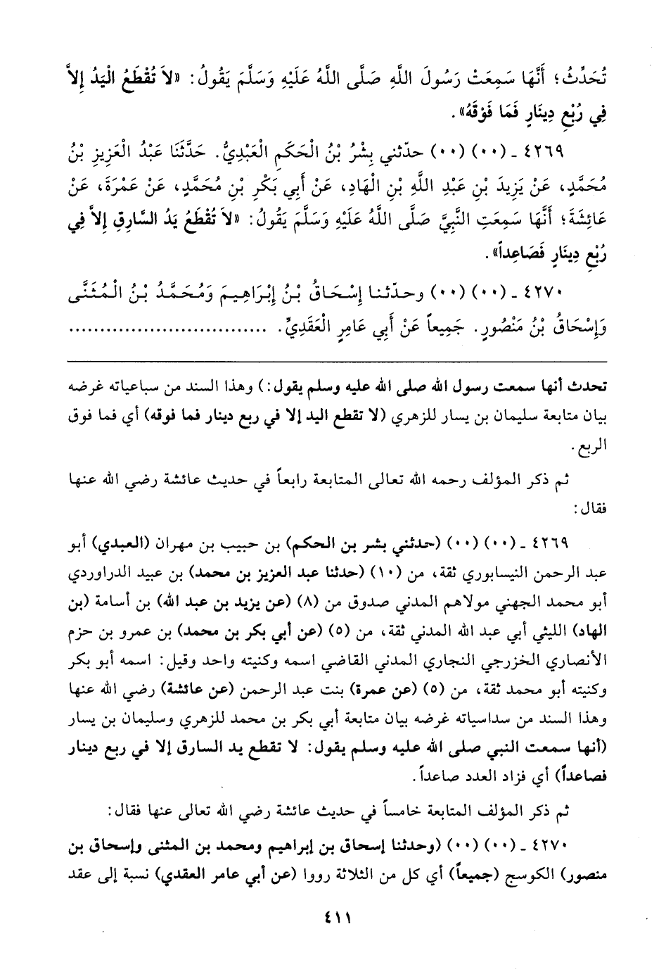 ٤٢٦٩ - (٠٠) (٠٠) حدّثني بِشْرُ بْنُ الْحَكَمِ الْعَبْدِيُّ. حَدَّثَنَا عَبْدُ الْعَزِيزِ بْنُ مُحَمَّدٍ، عَنْ يَزِيدَ بْنِ عَبْدِ الله بْنِ الْهَادِ، عَنْ أَبِي بَكْرِ بْنِ مُحَمَّدٍ، عَنْ عَمْرَةَ، عَنْ عَائِشَةَ؛ أَنَّهَا سَمِعَتِ النَّبِيَّ صَلَّى الله عَلَيهِ وسَلَّمَ يَقُولُ: "لا تُقْطَعُ يَدُ السَّارِقِ إلا فِي رُبع دِينَارٍ فَصَاعِدًا".