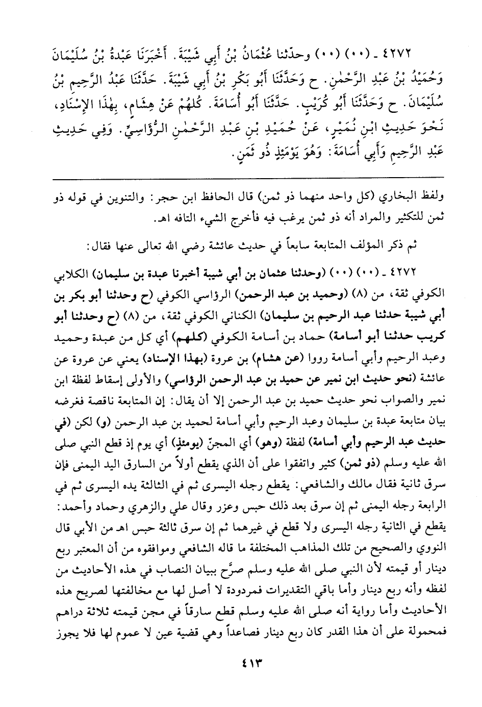 ٤٢٧٢ - (٠٠) (٠٠) (وحدثنا عثمان بن أبي شيبة أخبرنا عبدة بن سليمان) الكلابي الكُوفيّ ثِقَة، من (٨) (وحميد بن عبد الرَّحْمَن) الرؤاسي الكُوفيّ (ح وحدثنا أبو بكر بن أبي شيبة حَدَّثَنَا عبد الرَّحِيم بن سليمان) الكناني الكُوفيّ ثِقَة، من (٨) (ح وحدثنا أبو كُريب حَدَّثَنَا أبو أسامة) حماد بن أسامة الكوفي (كلهم) أي كل من عبدة وحميد وعبد الرَّحِيم وأبي أسامة رووا (عن هشام) بن عروة (بهذا الإسناد) يعني عن عروة عن عائشة (نحو حديث ابن نمير عن حميد بن عبد الرَّحْمَن الرؤاسي) والأولى إسقاط لفظة ابن نمير والصواب نحو حديث حميد بن عبد الرَّحْمَن إلَّا أن يقال: إن المتابعة ناقصة فغرضه بيان متابعة عبدة بن سليمان وعبد الرَّحِيم وأبي أسامة لحميد بن عبد الرَّحْمَن (و) لكن (في حديث عبد الرَّحِيم وأبي أسامة) لفظة (وهو) أي المجنّ (يومئذٍ) أي يوم إذ قطع النَّبِيّ صلى الله عليه وسلم (ذو ثمن) كثير واتفقوا على أن الذي يقطع أولًا من السارق اليد اليمنى فإن سرق ثانية فقال مالك والشافعي: يقطع رجله اليسرى ثم في الثالثة يده اليسرى ثم في الرابعة رجله اليمنى ثم إن سرق بعد ذلك حبس وعزر وقال علي والزهري وحماد وأَحمد: يقطع في الثَّانية رجله اليسرى ولا قطع في غيرهما ثم إن سرق ثالثة حبس اهـ من الأبي قال النووي والصحيح من تلك المذاهب المختلفة ما قاله الشَّافعيّ وموافقوه من أن المعتبر ربع دينار أو قيمته لأن النَّبِيّ صلى الله عليه وسلم صرَّح ببيان النصاب في هذه الأحاديث من لفظه وأنه ربع دينار وأما باقي التقديرات فمردودة لا أصل لها مع مخالفتها لصريح هذه الأحاديث وأما رواية أنَّه صلى الله عليه وسلم قطع سارقًا في مجن قيمته ثلاثة دراهم فمحمولة على أن هذا القدر كان ربع دينار فصاعدًا وهي قضية عين لا عموم لها فلا يجوز