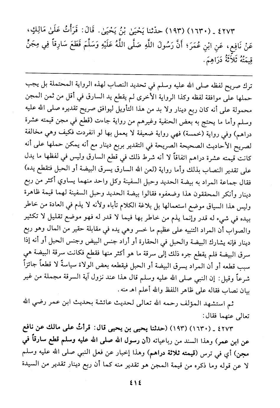 ٤٢٧٣ - (١٦٣٠) (١٩٣) (حَدَّثَنَا يحيى بن يحيى قال: قرأتُ على مالك عن نافع عن ابن عمر) وهذا السند من رباعياته (أن رسول الله صلى الله عليه وسلم قطع سارقًا في مجن) أي في ترس (قيمته ثلاثة دراهم) وهذا إخبار عن فعل النَّبِيّ صلى الله عليه وسلم لا عن قوله وما ذكره من قيمة المجن هو تقدير منه كما أن ربع دينار تقدير من السيدة