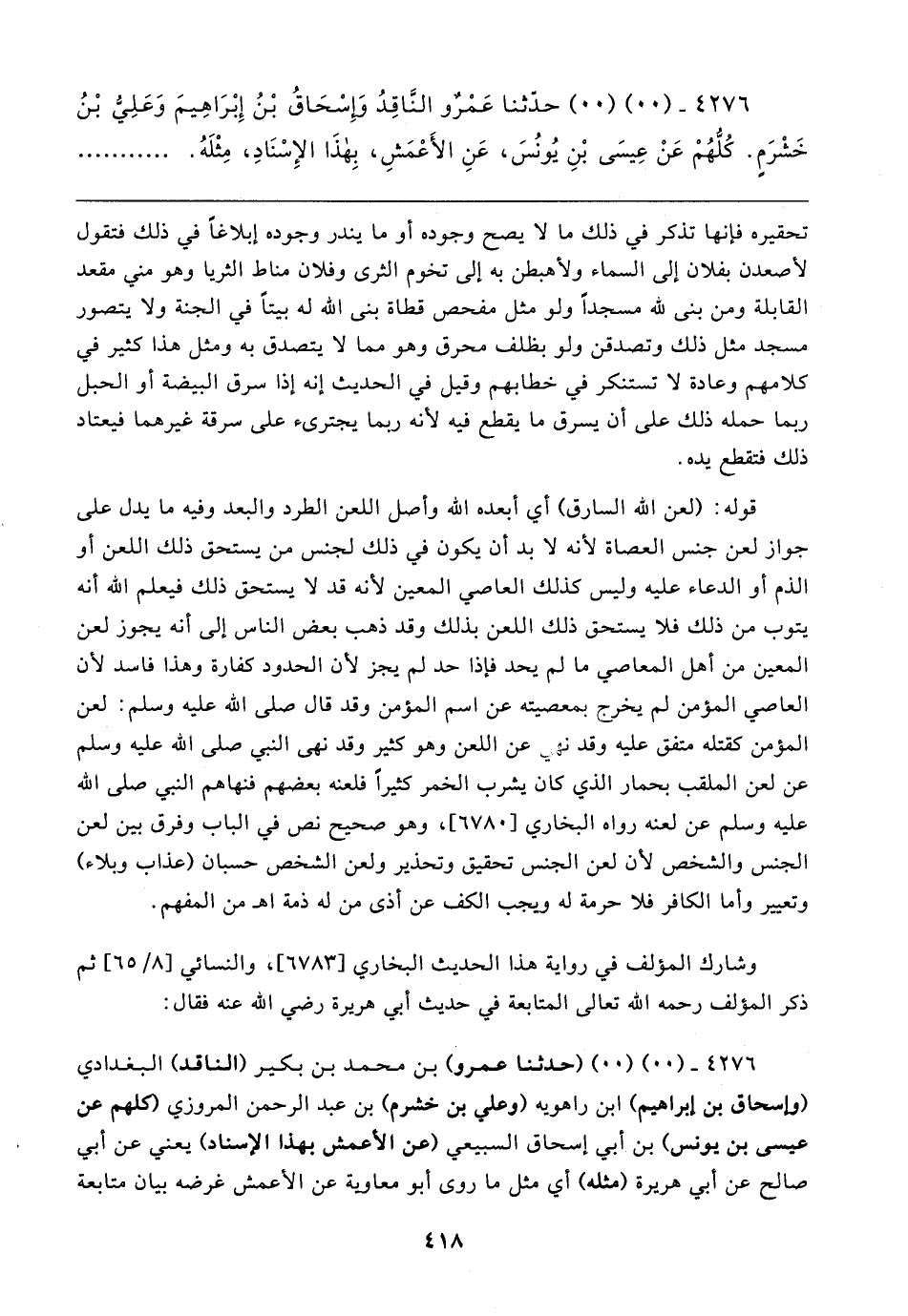 ٤٢٧٦ - (٠٠) (٠٠) حَدَّثَنَا عَمْرٌو النَّاقِدُ وَإِسْحَاقُ بْنُ إِبْرَاهِيمَ وَعَلِيُّ بْنُ خَشْرَمٍ. كُلُّهُمْ عَنْ عِيسَى بْنِ يُونُسَ، عَنِ الأَعْمَشِ، بِهذَا الإِسْنَادِ، مِثْلَهُ