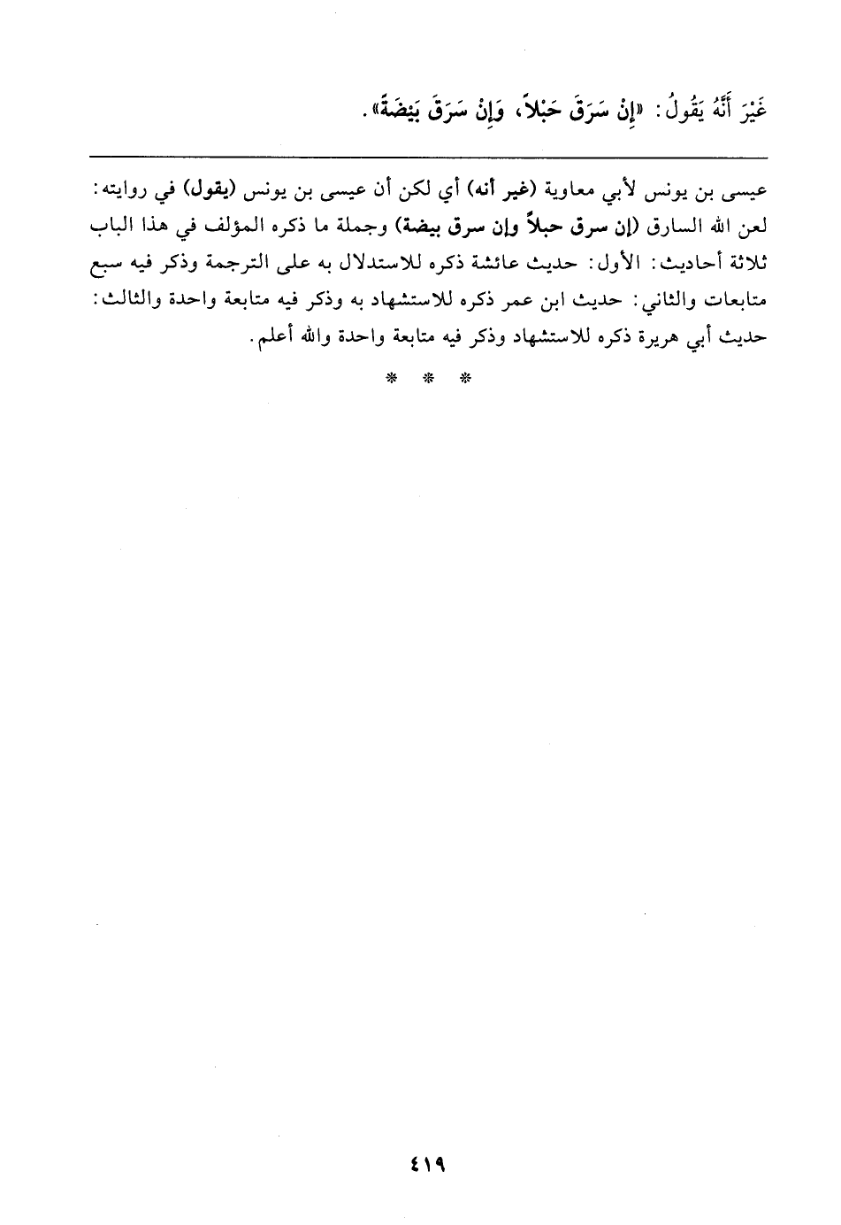 عيسى بن يونس لأبي معاوية (غير أنه) أي لكن أن عيسى بن يونس (يقول) في روايته: لعن الله السارق (إن سرق حبلًا وإن سرق بيضة) وجملة ما ذكره المؤلف في هذا الباب ثلاثة أحاديث: الأول: حديث عائشة ذكره للاستدلال به على الترجمة وذكر فيه سبع متابعات والثاني: حديث ابن عمر ذكره للاستشهاد به وذكر فيه متابعة واحدة والثالث: حديث أبي هريرة ذكره للاستشهاد وذكر فيه متابعة واحدة والله أعلم.