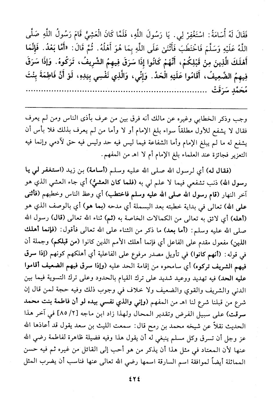فَقَال لَهُ أُسَامَةُ: اسْتَغْفِرْ لِي. يَا رَسُولَ اللهِ، فَلَمَّا كَانَ الْعَشِيُّ قَامَ رَسُولُ اللهِ صَلَّى اللهُ عَلَيهِ وَسَلَّمَ فَاخْتَطَبَ فَأَثْنَى عَلَى اللهِ بِمَا هُوَ أَهْلُهُ. ثُمَّ قَال: "أَمَّا بَعْدُ. فَإِنَّمَا أَهْلَكَ الَّذِينَ مِنْ قَبْلِكُمْ، أَنَّهُمْ كَانُوا إِذَا سَرَقَ فِيهِمُ الشَّرِيفُ، تَرَكُوهُ. وَإذَا سَرَقَ فِيهِمُ الضَّعِيفُ، أَقَامُوا عَلَيهِ الْحَدَّ. وَإِنِّي، وَالَّذِي نَفْسِي بِيَدِهِ، لَوْ أَنَّ فَاطِمَةَ بِنْتَ مُحَمَّدٍ سَرَقَتْ