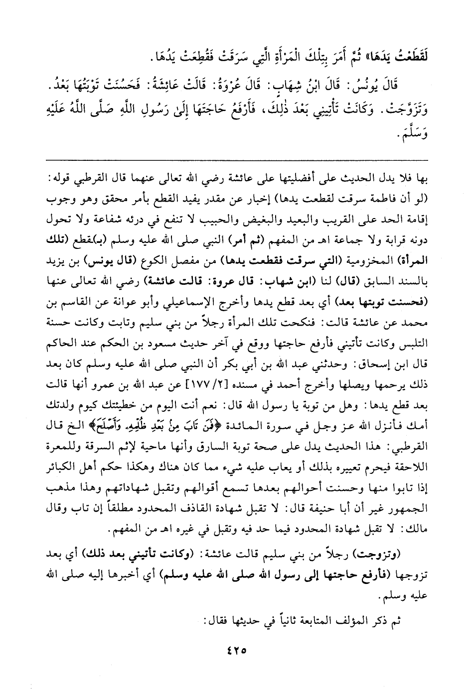بها فلا يدل الحديث على أفضليتها على عائشة رضي الله تعالى عنهما قال القرطبي قوله: (لو أن فاطمة سرقت لقطعت يدها) إخبار عن مقدر يفيد القطع بأمر محقق وهو وجوب إقامة الحد على القريب والبعيد والبغيض والحبيب لا تنفع في درئه شفاعة ولا تحول دونه قرابة ولا جماعة اهـ من المفهم (ثم أمر) النبي صلى الله عليه وسلم (بـ) ـقطع (تلك المرأة) المخزومية (التي سرقت فقطعت يدها) من مفصل الكوع (قال يونس) بن يزيد بالسند السابق (قال) لنا (ابن شهاب: قال عروة: قالت عائشة) رضي الله تعالى عنها (فحسنت توبتها بعد) أي بعد قطع يدها وأخرج الإسماعيلي وأبو عوانة عن القاسم بن محمد عن عائشة قالت: فنكحت تلك المرأة رجلًا من بني سليم وتابت وكانت حسنة التلبس وكانت تأتيني فأرفع حاجتها ووقع في آخر حديث مسعود بن الحكم عند الحاكم قال ابن إسحاق: وحدثني عبد الله بن أبي بكر أن النبي صلى الله عليه وسلم كان بعد ذلك يرحمها ويصلها وأخرج أحمد في مسنده [٢/ ١٧٧] عن عبد الله بن عمرو أنها قالت بعد قطع يدها: وهل من توبة يا رسول الله قال: نعم أنت اليوم من خطيئتك كيوم ولدتك أمك فأنزل الله عزَّ وجلَّ في سورة المائدة {فَمَنْ تَابَ مِنْ بَعْدِ ظُلْمِهِ وَأَصْلَحَ} الخ قال القرطبي: هذا الحديث يدل على صحة توبة السارق وأنها ماحية لإثم السرقة وللمعرة اللاحقة فيحرم تعييره بذلك أو يعاب عليه شيء مما كان هناك وهكذا حكم أهل الكبائر إذا تابوا منها وحسنت أحوالهم بعدها تسمع أقوالهم وتقبل شهاداتهم وهذا مذهب الجمهور غير أن أبا حنيفة قال: لا تقبل شهادة القاذف المحدود مطلقًا إن تاب وقال مالك: لا تقبل شهادة المحدود فيما حد فيه وتقبل في غيره اهـ من المفهم.