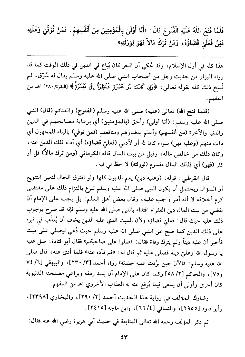 فَلَمَّا فَتَحَ اللهُ عَلَيهِ الْفُتُوحَ قَال: "أَنا أَوْلَى بِالْمُؤْمِنِينَ مِنْ أَنْفُسِهِمْ. فَمَنْ تُوُفِّيَ وَعَلَيهِ دَينٌ فَعَلَيَّ قَضَاؤُهُ، وَمَنْ تَرَكَ مَالًا فَهُوَ لِوَرَثَتِهِ"