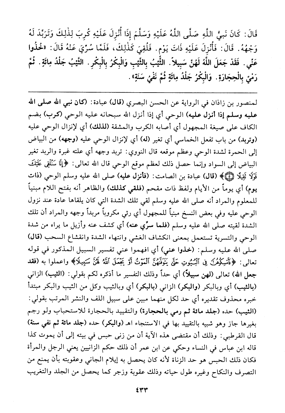 قَال: كَانَ نَبيُّ اللهِ صَلَّى اللهُ عَلَيهِ وَسَلَّمَ إِذَا أُنْزِلَ عَلَيهِ كُرِبَ لِذلِكَ وَتَرَبَّدَ لَهُ وَجْهُهُ. قَال: فَأُنْزِلَ عَلَيهِ ذَاتَ يَوْمٍ. فَلُقِيَ كَذلِكَ، فَلَمَّا سُرِّيَ عَنْهُ قَال: "خُذُوا عَنِّي. فَقَدْ جَعَلَ اللهُ لَهُنَّ سَبِيلًا. الثَّيِّبُ بِالثَّيِّبِ وَالْبِكْرُ بِالْبِكْرِ. الثَّيِّبُ جَلْدُ مِائَةٍ. ثُمَّ رَمْيٌ بِالْحِجَارَةِ. وَالْبِكْرُ جَلْدُ مِائَةٍ ثُمَّ نَفْيُ سَنَةٍ"