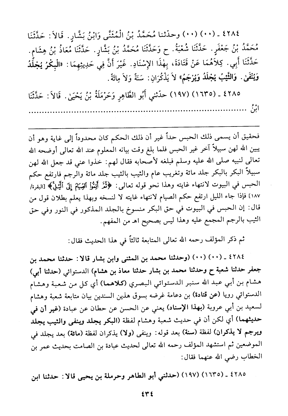 ٤٢٨٤ - (٠٠) (٠٠) (وحدثنا محمد بن المثنى وابن بشار قالا: حدثنا محمد بن جعفر حدثنا شعبة ح وحدثنا محمد بن بشار حدثنا معاذ بن هشام) الدستوائي (حدثنا أبي) هشام بن أبي عبد الله سنبر الدستوائي البصري (كلاهما) أي كل من شعبة وهشام الدستوائي رويا (عن قتادة) بن دعامة غرضه بسوق هذين السندين بيان متابعة شعبة وهشام لسعيد بن أبي عروبة (بهذا الإسناد) يعني عن الحسن عن حطان عن عبادة (غير أن في حديثهما) أي لكن أن في حديث شعبة وهشام لفظة (البكر يجلد وينفى والثيب يجلد ويرجم لا يذكران) لفظة (سنة) بعد قوله: وينفى (ولا) يذكران لفظة (مائة) بعد يجلد في الموضعين ثم استشهد المؤلف رحمه الله تعالى لحديث عبادة بن الصامت بحديث عمر بن الخطاب رضي الله عنهما فقال: