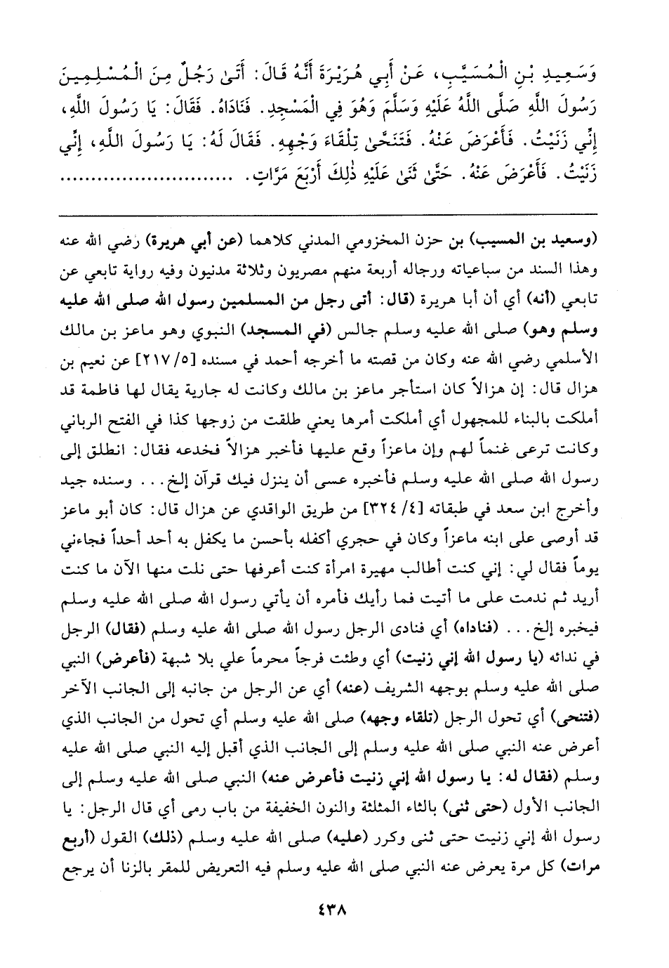 وَسَعِيدِ بْنِ الْمُسَيَّبِ، عَنْ أَبِي هُرَيرَةَ أَنَّهُ قَال: أَتَى رَجُلٌ مِنَ الْمُسْلِمِينَ رَسُولَ اللهِ صَلَّى اللهُ عَلَيهِ وَسَلَّمَ وَهُوَ فِي الْمَسْجِدِ. فَنَادَاهُ. فَقَال: يَا رَسُولَ اللهِ، إِنِّي زَنَيتُ. فَأَعْرَضَ عَنْهُ. فَتَنَحَّى تِلْقَاءَ وَجْهِهِ. فَقَال لَهُ: يَا رَسُولَ اللهِ، إِنِّي زَنَيتُ. فَأَعْرَضَ عَنْهُ. حَتَّى ثَنَى عَلَيهِ ذلِكَ أَرْبَعَ مَرَّاتٍ
