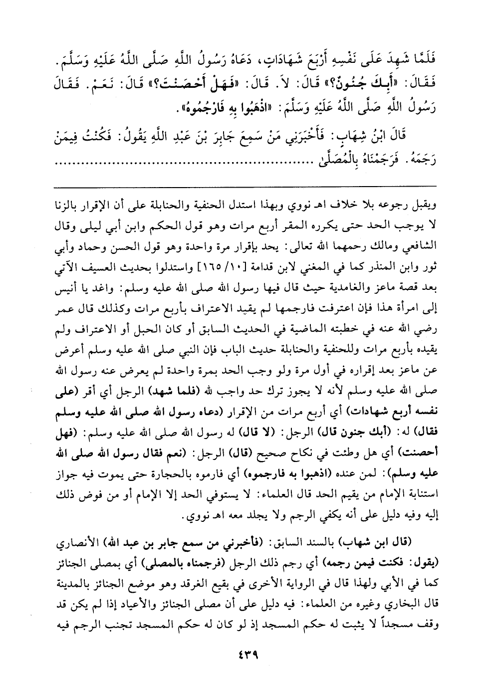 فَلَمَّا شَهِدَ عَلَى نَفْسِهِ أَرْبَعَ شَهَادَاتٍ، دَعَاهُ رَسُولُ اللهِ صَلَّى اللهُ عَلَيهِ وَسَلَّمَ. فَقَال: "أَبِكَ جُنُونٌ؟ " قَال: لَا. قَال: "فَهَلْ أَحْصَنْتَ؟ " قَال: نَعَمْ. فَقَال رَسُولُ اللهِ صَلَّى اللهُ عَلَيهِ وَسَلَّمَ: "اذْهَبُوا بِهِ فَارْجُمُوهُ".