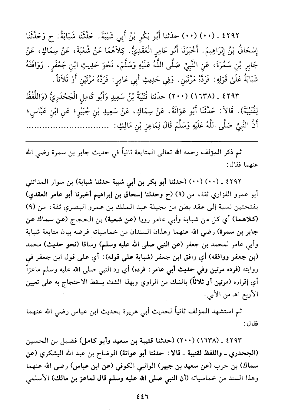٤٢٩٢ - (٠٠) (٠٠) (حدثنا أبو بكر بن أبي شيبة حدثنا شبابة) بن سوار المدائني أبو عمرو الفزاري ثقة، من (٩) (ح وحدثنا إسحاق بن إبراهيم أخبرنا أبو عامر العقدي) بفتحتين نسبة إلى عقد بطن من بجيلة عبد الملك بن عمرو البصري ثقة، من (٩) (كلاهما) أي كل من شبابة وأبي عامر رويا (عن شعبة) بن الحجاج (عن سماك عن جابر بن سمرة) رضي الله عنهما وهذان السندان من خماسياته غرضه بيان متابعة شبابة وأبي عامر لمحمد بن جعفر (عن النبي صلى الله عليه وسلم) وساقا (نحو حديث) محمد (بن جعفر ووافقه) أي وافق ابن جعفر (شبابة على قوله): أي على قول ابن جعفر في روايته (فرده مرتين وفي حديث أبي عامر: فرده) أي رد النبي صلى الله عليه وسلم ماعزًا أي إقراره (مرتين أو ثلاثًا) بالشك من الراوي وبهذا الشك يسقط الاحتجاج به على تعيين الأربع اهـ من الأبي.