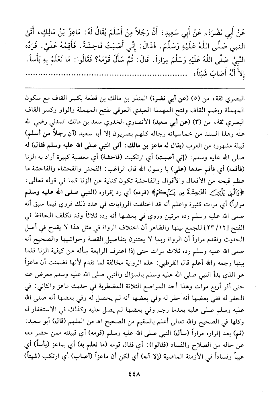 عَنْ أَبِي نَضْرَةَ، عَنْ أَبِي سَعِيدٍ؛ أَنَّ رَجُلًا مِنْ أَسْلَمَ يُقَالُ لَهُ: مَاعِزُ بْنُ مَالِكٍ، أَتَى النبي صَلَّى اللهُ عَلَيهِ وَسَلَّمَ. فَقَال: إِنِّي أَصَبْتُ فَاحِشَةً. فَأَقِمْهُ عَلَيَّ. فَرَدَّه النَّبِيُّ صَلَّى اللهُ عَلَيهِ وَسَلَّمَ مِرَارًا. قَال: ثُمَّ سَأَلَ قَوْمَهُ؟ فَقَالُوا: مَا نَعْلَمُ بِهِ بَأْسًا. إِلَّا أَنَّهُ أَصَابَ شَيئًا،
