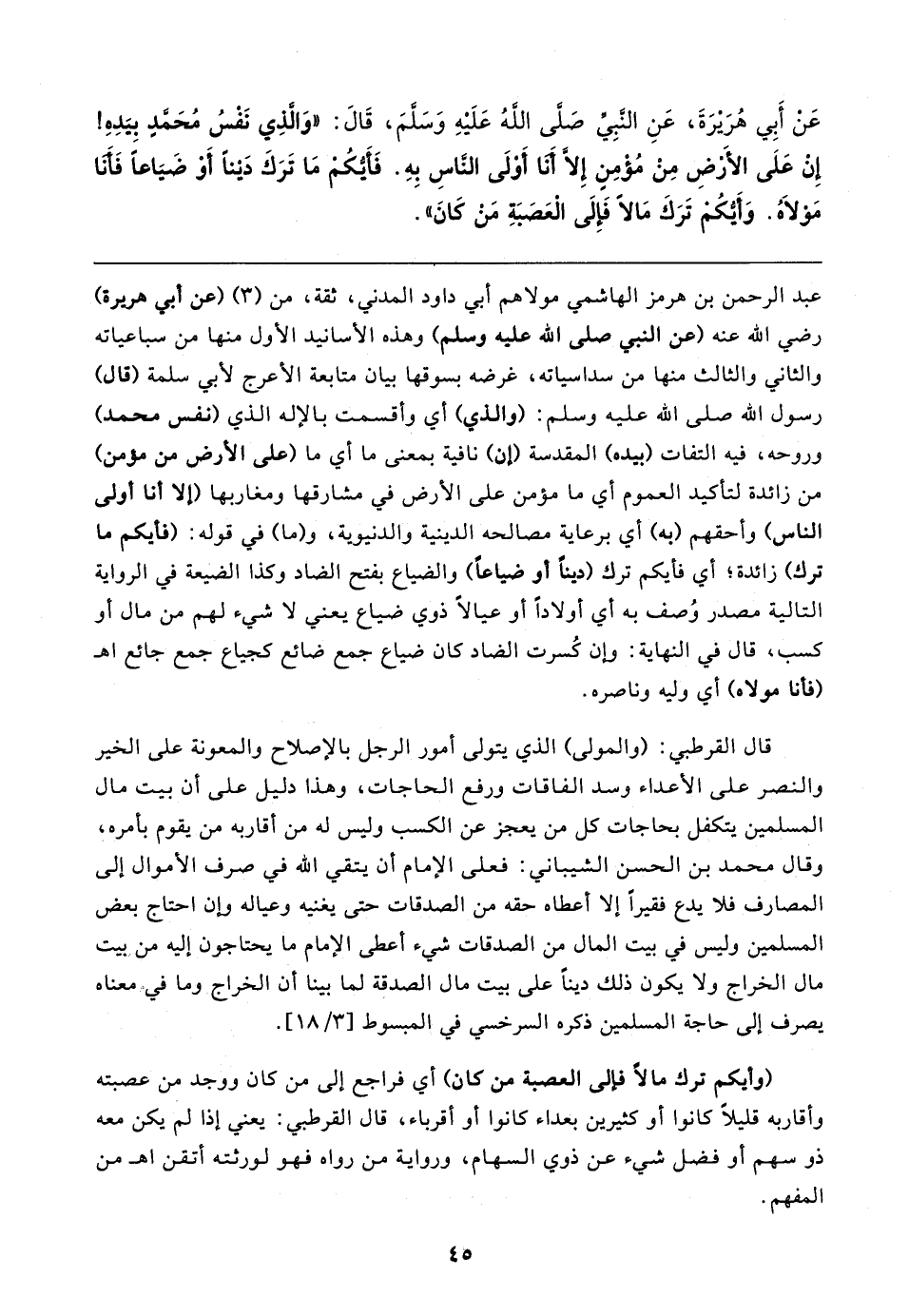 عَنْ أَبِي هُرَيرَةَ، عَنِ النَّبِيِّ صَلَّى اللهُ عَلَيهِ وَسَلَّمَ، قَال: "وَالَّذِي نَفْسُ مُحَمَّدٍ بِيَدِهِ! إِنْ عَلَى الأَرْضِ مِنْ مُؤْمِنٍ إلا أنَا أَوْلَى النَّاسِ بِهِ. فَأَيُّكُمْ مَا تَرَكَ دَينًا أَوْ ضَيَاعًا فَأَنَا مَوْلاهُ. وَأَيُّكُمْ تَرَكَ مَالًا فَإِلَى الْعَصَبَةِ مَنْ كَانَ"