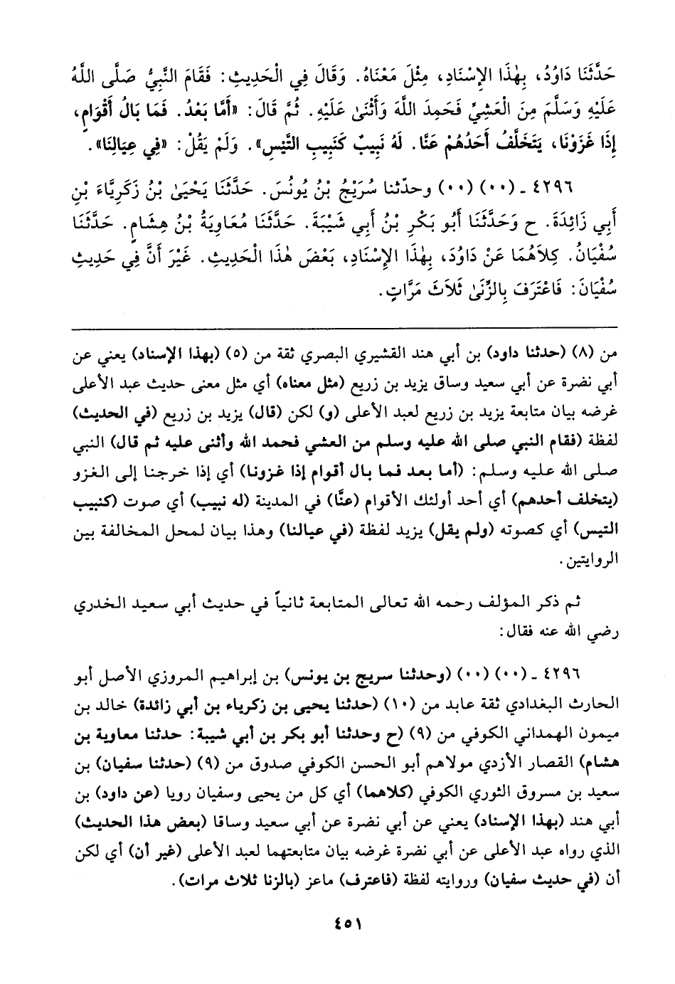 ٤٢٩٦ - (٠٠) (٠٠) (وحدثنا سريج بن يونس) بن إبراهيم المروزي الأصل أبو الحارث البغدادي ثقة عابد من (١٠) (حدثنا يحيى بن زكرياء بن أبي زائدة) خالد بن ميمون الهمداني الكوفي من (٩) (ح وحدثنا أبو بكر بن أبي شيبة: حدثنا معاوية بن هشام) القصار الأزدي مولاهم أبو الحسن الكوفي صدوق من (٩) (حدثنا سفيان) بن سعيد بن مسروق الثوري الكوفي (كلاهما) أي كل من يحيى وسفيان رويا (عن داود) بن أبي هند (بهذا الإسناد) يعني عن أبي نضرة عن أبي سعيد وساقا (بعض هذا الحديث) الذي رواه عبد الأعلى عن أبي نضرة غرضه بيان متابعتهما لعبد الأعلى (غير أن) أي لكن أن (في حديث سفيان) وروايته لفظة (فاعترف) ماعز (بالزنا ثلاث مرات).