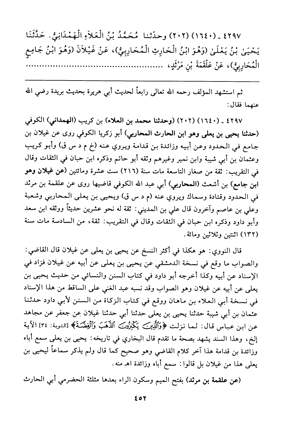 ٤٢٩٧ - (١٦٤٠) (٢٠٢) وحدّثنا مُحَمَّدُ بْنُ الْعَلاءِ الْهَمْدَانِيُّ. حَدَّثَنَا يَحْيَى بْنُ يَعْلَى (وَهُوَ ابْنُ الْحَارِثِ الْمُحَارِبِيُّ)، عَنْ غَيلانَ (وَهُوَ ابْنُ جَامِعٍ الْمُحَارِبِيُّ)، عَنْ عَلْقَمَةَ بْنِ مَرْثَدٍ،