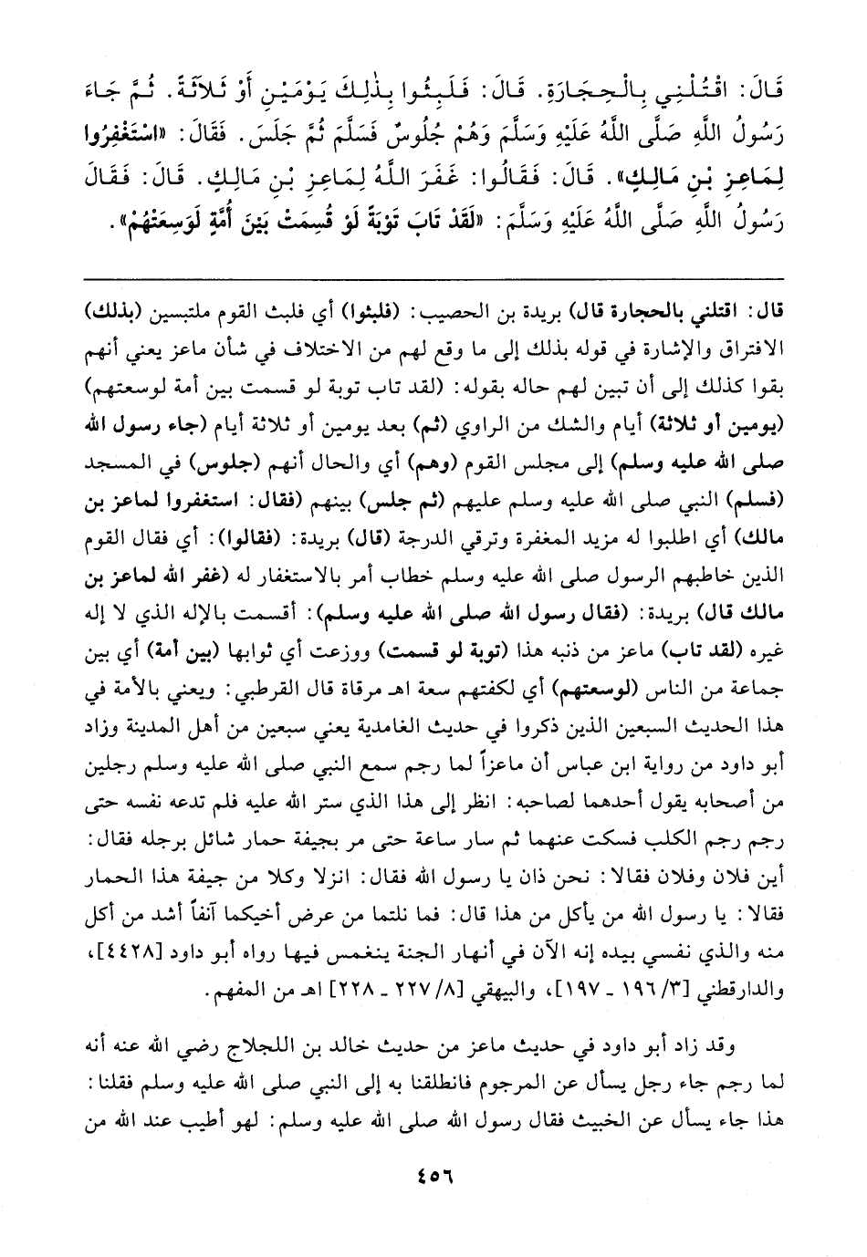قَال: اقْتُلْنِي بِالْحِجَارَةِ. قَال: فَلَبِثُوا بِذلِكَ يَوْمَينِ أَوْ ثَلاثَةً. ثُمَّ جَاءَ رَسُولُ اللهِ صلَّى اللهُ عَلَيهِ وَسَلَّمَ وَهُمْ جُلُوسٌ فَسَلَّمَ ثُمَّ جَلَسَ. فَقَال: "اسْتَغْفِرُوا لِمَاعِزِ بْنِ مَالِكٍ". قَال: فَقَالُوا: غَفَرَ اللهُ لِمَاعِزِ بْنِ مَالِكٍ. قَال: فَقَال رَسُولُ اللهِ صَلَّى اللهُ عَلَيهِ وَسَلَّمَ: "لَقَدْ تَابَ تَوْبَةً لَوْ قُسِمَتْ بَينَ أُمَّةٍ لَوَسِعَتْهُمْ"