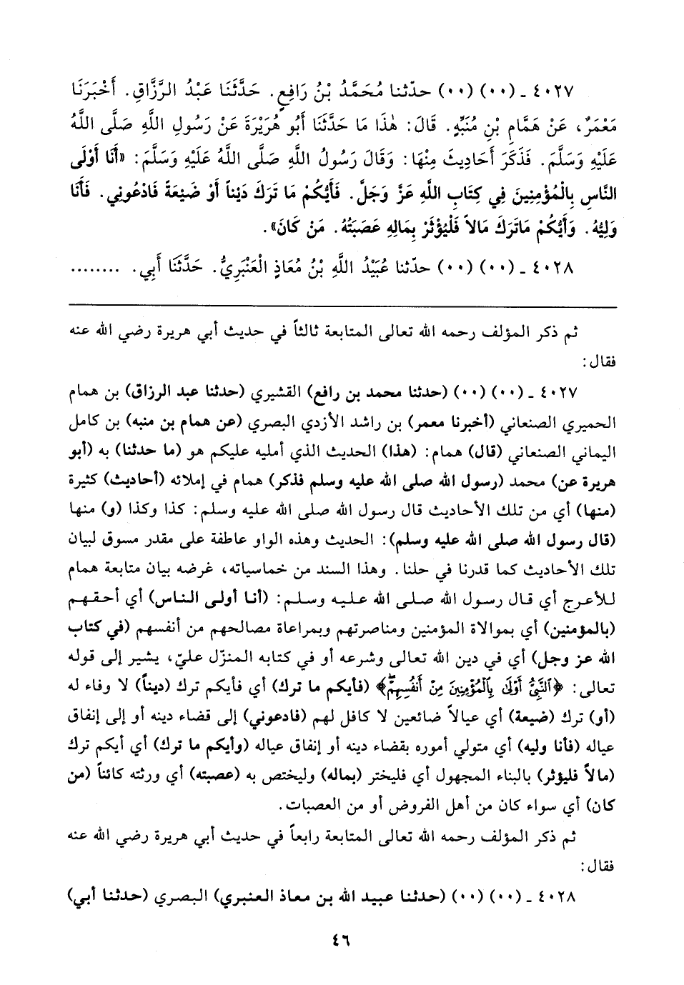 ٤٠٢٧ - (٠٠) (٠٠) (حدثنا محمد بن رافع) القشيري (حدثنا عبد الرزاق) بن همام الحميري الصنعاني (أخبرنا معمر) بن راشد الأزدي البصري (عن همام بن منبه) بن كامل اليماني الصنعاني (قال) همام: (هذا) الحديث الذي أمليه عليكم هو (ما حدثنا) به (أبو هريرة عن) محمد (رسول الله صلى الله عليه وسلم فذكر) همام في إملائه (أحاديث) كثيرة (منها) أي من تلك الأحاديث قال رسول الله صلى الله عليه وسلم: كذا وكذا (و) منها (قال رسول الله صلى الله عليه وسلم): الحديث وهذه الواو عاطفة على مقدر مسوق لبيان تلك الأحاديث كما قدرنا في حلنا. وهذا السند من خماسياته، غرضه بيان متابعة همام للأعرج أي قال رسول الله صلى الله عليه وسلم: (أنا أولى الناس) أي أحقهم (بالمؤمنين) أي بموالاة المؤمنين ومناصرتهم وبمراعاة مصالحهم من أنفسهم (في كتاب الله عزَّ وجلَّ) أي في دين الله تعالى وشرعه أو في كتابه المنزّل علي، يشير إلى قوله تعالى: {النَّبِيُّ أَوْلَى بِالْمُؤْمِنِينَ مِنْ أَنْفُسِهِمْ} (فأيكم ما ترك) أي فأيكم ترك (دينًا) لا وفاء له (أو) ترك (ضيعة) أي عيالًا ضائعين لا كافل لهم (فادعوني) إلى قضاء دينه أو إلى إنفاق عياله (فأنا وليه) أي متولي أموره بقضاء دينه أو إنفاق عياله (وأيكم ما ترك) أي أيكم ترك (مالًا فليؤثر) بالبناء المجهول أي فليختر (بماله) وليختص به (عصبته) أي ورثته كائنًا (من كان) أي سواء كان من أهل الفروض أو من العصبات.