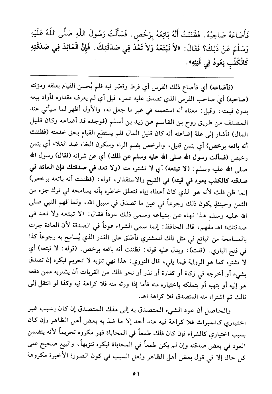 فَأَضَاعَهُ صَاحِبُهُ. فَظَنَنْتُ أَنَّهُ بَائِعُهُ بِرُخْصٍ. فَسَأَلْتُ رَسُولَ اللهِ صَلَّى اللهُ عَلَيهِ وَسَلَّمَ عَنْ ذلِكَ؟ فَقَال: "لَا تَبْتَعْهُ وَلَا تَعُدْ فِي صَدَقَتِكَ. فَإِن الْعَائِدَ فِي صَدَقَتِهِ كَالْكَلْبِ يَعُودُ فِي قَيئِهِ"