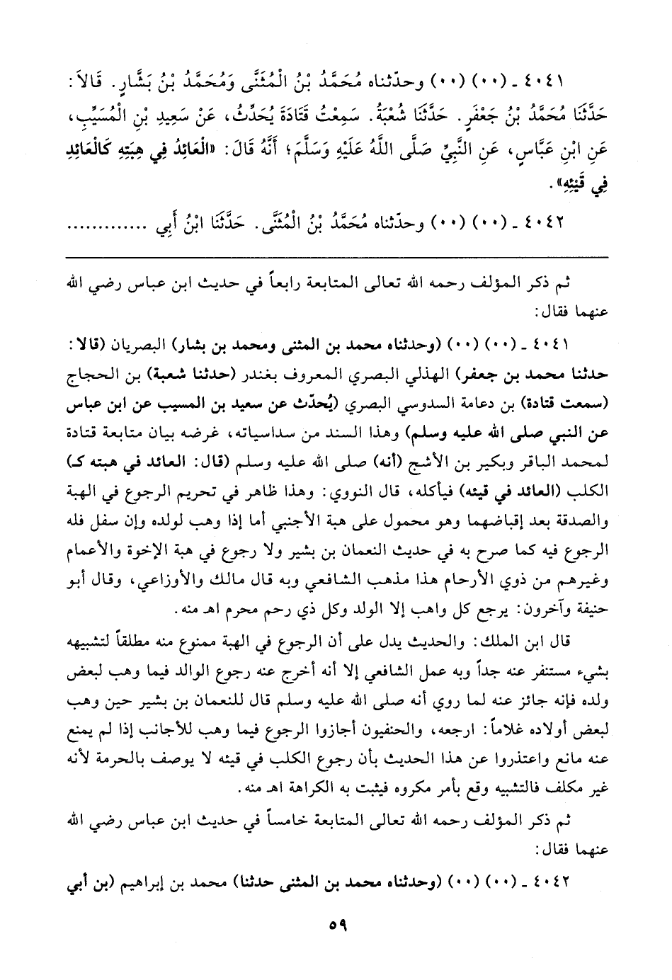 ٤٠٤١ - (٠٠) (٠٠) وحدّثناه مُحَمَّدُ بْنُ الْمُثَنَّى وَمُحَمَّدُ بْنُ بَشَّارٍ. قَالا: حَدَّثنَا مُحَمَّدُ بْنُ جَعْفَرٍ. حَدَّثنَا شُعْبَةُ. سَمِعْتُ قَتَادَةَ يُحَدِّثُ، عَنْ سَعِيدِ بْنِ الْمُسَيِّبِ، عَنِ ابْنِ عَبَّاسٍ، عَنِ النَّبِيِّ صَلَّى اللهُ عَلَيهِ وَسَلَّمَ؛ أَنَّهُ قَال: "الْعَائِدُ فِي هِبَتِهِ كَالْعَائِدِ فِي قَيئِهِ".