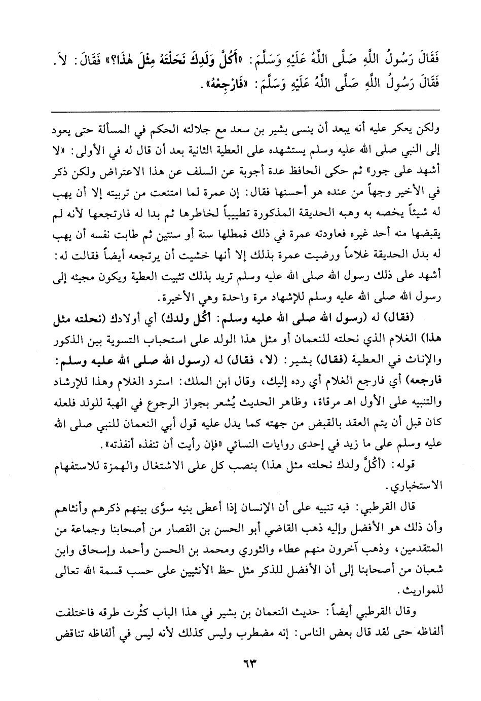 فَقَال رَسُولُ اللهِ صلَّى اللهُ عَلَيهِ وَسَلَّمَ: "أَكُلَّ وَلَدِكَ نَحَلْتَهُ مِثْلَ هذَا؟ " فَقَال: لَا. فَقَال رَسُولُ اللهِ صَلَّى اللهُ عَلَيهِ وَسَلَّمَ: "فَارْجِعْهُ"