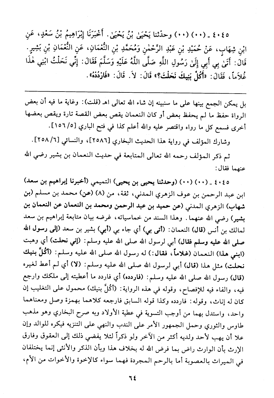 ٤٠٤٥ - (٠٠) (٠٠) وحدّثنا يَحْيَى بْنُ يَحْيَى. أَخْبَرَنَا إِبْرَاهِيمُ بْنُ سَعْدٍ، عَنِ ابْنِ شِهَابٍ، عَنْ حُمَيدِ بْنِ عَبْدِ الرَّحْمنِ وَمُحَمَّدِ بْنِ النُّعْمَانِ، عَنِ النُعْمَانِ بْنِ بَشِيرٍ. قَال: أَتَى بِي أبِي إِلَى رَسُولِ اللهِ صَلَّى اللهُ عَلَيهِ وَسَلَّمَ فَقَال: إِنِّي نَحَلْتُ ابْنِي هذَا غُلامًا، فَقَال: "أكُلَّ بنِيكَ نَحَلْتَ؟ " قال: لَا. قَال: "فَارْدُدْهُ"