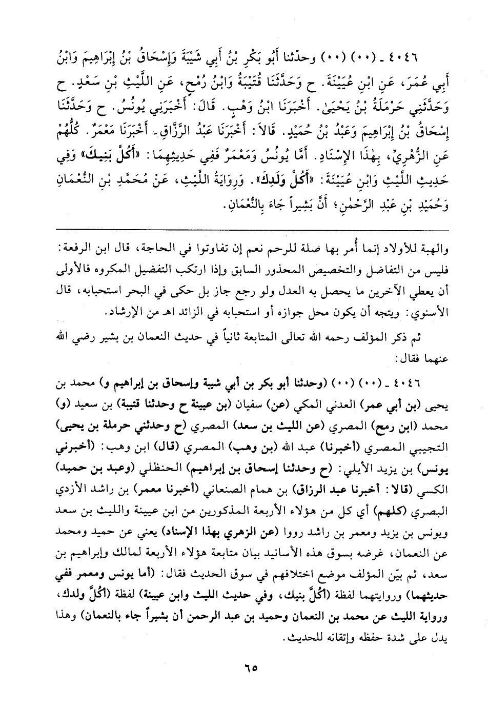 ٤٠٤٦ - (٠٠) (٠٠) (وحدثنا أبو بكر بن أبي شيبة وإسحاق بن إبراهيم و) محمد بن يحيى (بن أبي عمر) العدني المكي (عن) سفيان (بن عيبنة ح وحدثنا قتيبة) بن سعيد (و) محمد (ابن رمح) المصري (عن الليث بن سعد) المصري (ح وحدثني حرملة بن يحيى) التجيبي المصري (أخبرنا) عبد الله (بن وهب) المصري (قال) ابن وهب: (أخبرني بونس) بن يزيد الأيلي: (ح وحدثنا إسحاق بن إبراهيم) الحنظلي (وعبد بن حميد) الكسي (قالا: أخبرنا عبد الرزاق) بن همام الصنعاني (أخبرنا معمر) بن راشد الأزدي البصري (كلهم) أي كل من هؤلاء الأربعة المذكورين من ابن عيينة والليث بن سعد ويونس بن يزيد ومعمر بن راشد رووا (عن الزهري بهذا الإسناد) يعني عن حميد ومحمد عن النعمان، غرضه بسوق هذه الأسانيد بيان متابعة هؤلاء الأربعة لمالك وإبراهيم بن سعد، ثم بيّن المؤلف موضع اختلافهم في سوق الحديث فقال: (أما يونس ومعمر ففي حديثهما) وروايتهما لفظة (أكُلَّ بنيك، وفي حديث الليث وابن عيبنة) لفظة (أكُلَّ ولدك، ورواية الليث عن محمد بن النعمان وحميد بن عبد الرحمن أن بشيرًا جاء بالنعمان) وهذا يدل على شدة حفظه وإتقانه للحديث.