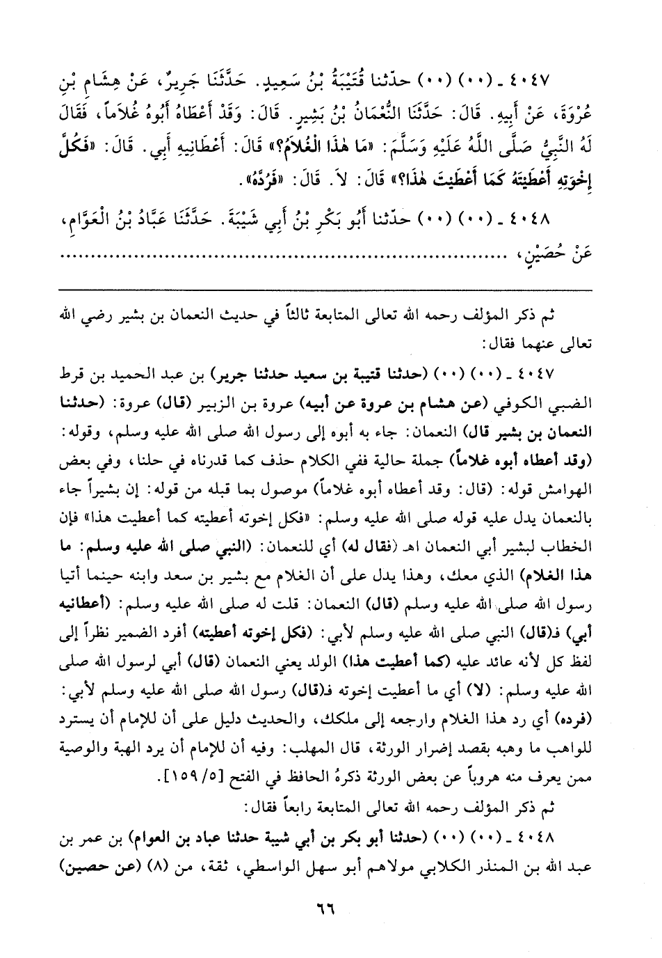 ٤٠٤٧ - (٠٠) (٠٠) حدَّثنا قُتَيبَةُ بْنُ سَعِيدٍ. حَدَّثَنَا جَرِيرٌ، عَنْ هِشَامِ بْنِ عُرْوَةَ، عَنْ أَبِيهِ. قَال: حَدَّثَنَا النُعْمَانُ بْنُ بَشِيرٍ. قَال: وَقَدْ أَعْطَاهُ أَبُوهُ غُلامًا، فَقَال لَهُ النَّبِيُّ صَلَّى اللهُ عَلَيهِ وَسَلَّمَ: "مَا هذَا الْغُلامُ؟ " قَال: أَعْطَانِيهِ أَبِي. قَال: "فَكُلَّ إِخْوَتِهِ أَعْطَيتَهُ كَمَا أَعْطَيتَ هذَا؟ " قَال: لَا. قَال: "فَرُدَّهُ".