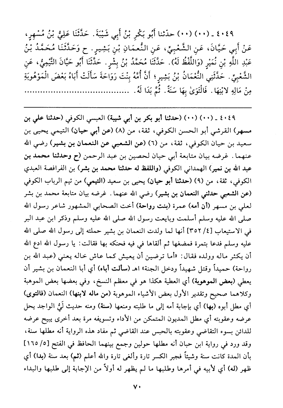 ٤٠٤٩ - (٠٠) (٠٠) (حَدَّثَنَا أبو بكر بن أبي شيبة) العبسي الكوفي (حَدَّثَنَا علي بن مسهر) القرشي أبو الحسن الكوفي، ثقة، من (٨) (عن أبي حيان) التيمي يحيى بن سعيد بن حيان الكوفي، ثقة، من (٦) (عن الشعبي عن النعمان بن بشير) رضي الله عنهما. غرضه بيان متابعة أبي حيان لحصين بن عبد الرحمن (ح وحدثنا محمد بن عبد الله بن نمير) الهمداني الكوفي (واللفظ له حَدَّثَنَا محمد بن بشر) بن الفرافصة العبدي الكوفي، ثقة، من (٩) (حَدَّثَنَا أبو حيان) يحيى بن سعيد (التيمي) من تيم الرباب الكوفي (عن الشعبي حدثني النعمان بن بشير) رضي الله عنهما. غرضه بيان متابعة محمد بن بشر لعلي بن مسهر (أن أمه) عمرة (بنت رواحة) أخت الصحابي المشهور شاعر رسول الله صلى الله عليه وسلم أسلمت وبايعت رسول الله صلى الله عليه وسلم وذكر ابن عبد البر في الاستيعاب أنها لما ولدت النعمان بن بشير حملته إلى رسول الله صلى الله عليه وسلم فدعا بتمرة فمضغها ثم ألقاها في فيه فحنكه بها فقالت: يا رسول الله ادع الله أن يكثر ماله وولده فقال: "أما ترضين أن يعيش كما عاش خاله يعني (عبد الله بن رواحة) حميدًا وقتل شهيدًا ودخل الجنّة" اهـ (سألت أباه) أي أبا النعمان بن بشير أن يعطي (بعض الموهوبة) أي العطية هكذا هو في معظم النسخ، وفي بعضها بعض الموهبة وكلاهما صحيح وتقدير الأول بعض الأشياء الموهوبة (من ماله لابنها) النعمان (فالتوى) أي مطل أبوه (بها) أي بإجابة أمه إلى ما طلبته ومنعها (سنة) ومنه حديث لَيُّ الواجد يحل عرضه وعقوبته أي مطل المديون المتمكن من الأداء وتسويفه مرة بعد أخرى يبيح عرضه للدائن بسوء التقاضي وعقوبته بالحبس عند القاضي ثم مفاد هذه الرواية أنَّه مطلها سنة، وقد ورد في رواية ابن حبان أنَّه مطلها حولين وجمع بينهما الحافظ في الفتح [٥/ ١٦٥] بأن المدة كانت سنة وشيئًا فجبر الكسر تارة وألغى تارة والله أعلم (ثم) بعد سنة (بدا) أي ظهر (له) أي لأبيه في أمرها وطلبها ما لم يظهر له أولًا من الإجابة إلى طلبها والبداء
