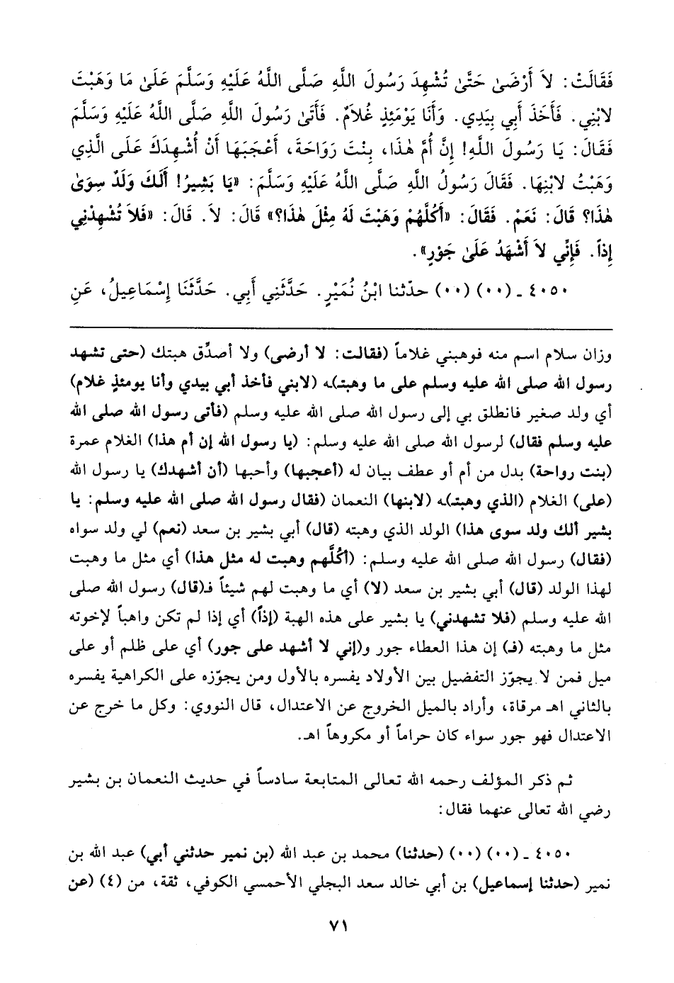 فَقَالتْ: لَا أَرْضَى حَتَّى تُشْهِدَ رَسُولَ اللهِ صَلَّى اللهُ عَلَيهِ وَسَلَّمَ عَلَى مَا وَهَبْتَ لابْنِي. فَأَخَذَ أَبِي بِيَدِي. وَأَنَا يَوْمَئِذٍ غُلَامٌ. فَأَتَى رَسُولَ اللهِ صَلَّى اللهُ عَلَيهِ وَسَلَّمَ فَقَال: يَا رَسُولَ اللهِ! إِنَّ أُمَّ هذَا، بِنْتَ رَوَاحَةَ، أَعْجَبَهَا أَنْ أُشْهِدَكَ عَلَى الَّذِي وَهَبْتُ لابْنِهَا. فَقَال رَسُولُ اللهِ صَلَّى اللهُ عَلَيهِ وَسَلَّمَ: "يَا بَشِيرُ! أَلَكَ وَلَدٌ سِوَى هذَا؟ قَال: نَعَمْ. فَقَال: لا أَكُلَّهُمْ وَهَبتَ لَهُ مِثْلَ هذَا؟ " قَال: لَا. قَال: "فَلَا تُشْهِدْنِي إِذًا. فَإِنِّي لَا أَشهَدُ عَلَى جَوْرٍ".