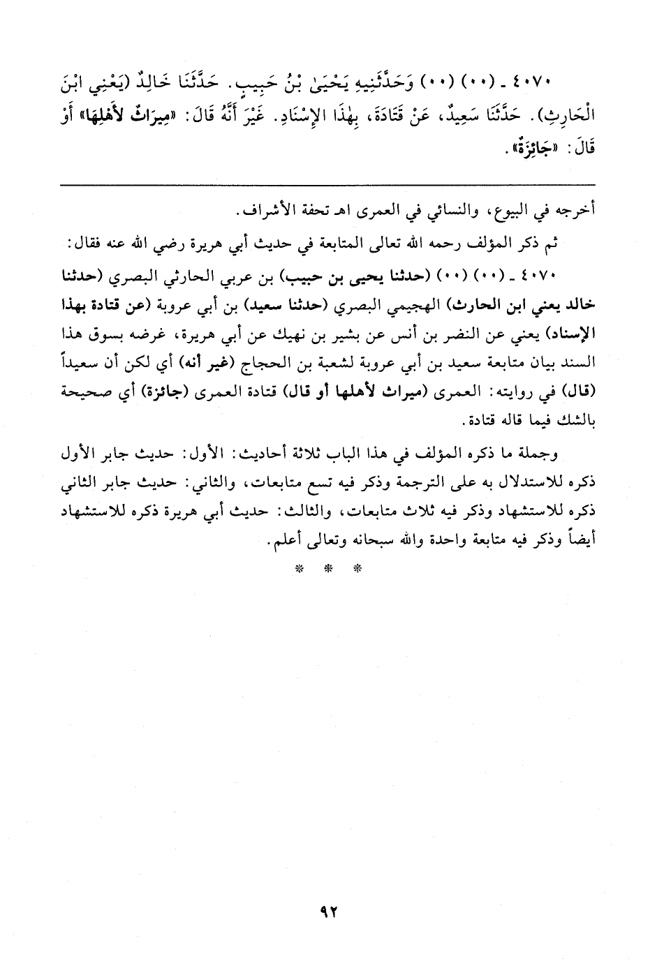 ٤٠٧٠ - (٠٠) (٠٠) (حَدَّثَنَا يحيى بن حبيب) بن عربي الحارثي البصري (حَدَّثَنَا خالد يعني ابن الحارث) الهجيمي البصري (حَدَّثَنَا سعيد) بن أبي عروبة (عن قتادة بهذا الإسناد) يعني عن النضر بن أنس عن بشير بن نهيك عن أبي هريرة، غرضه بسوق هذا السند بيان متابعة سعيد بن أبي عروبة لشعبة بن الحجاج (غير أنَّه) أي لكن أن سعيدًا (قال) في روايته: العمرى (ميراث لأهلها أو قال) قتادة العمرى (جائزة) أي صحيحة بالشك فيما قاله قتادة.