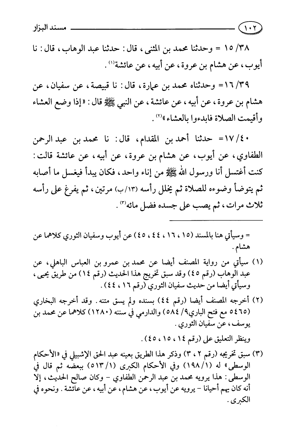 40- حدثنا أحمد بن المقدام، قالَ: حَدَّثَنا مُحَمَّدُ بْنُ عَبْدِ الرَّحْمَنِ الطُّفَاوِيُّ , عَنْ أَيُّوبَ , عن هشام بن عروة , عن أبيه , عن عائشة رضي الله عنها قالت: كنت أغتسل أنا ورسول اللَّهِ صَلَّى اللَّهُ عَلَيْهِ وَسَلَّمَ مِنْ إِنَاءٍ واحد فكان يبدأ فيغسل ما أصابه ثم يتوضأ وضوءه للصلاة ثم يخلل رأسه مرتين ثم يفرغ على رأسه ثلاث مرات ثم يصب على جسده فضل مائه.