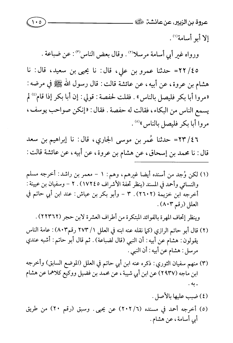 45- حدثنا عمرو بن علي، قالَ: حَدَّثَنا يحيى بن سعيد، قالَ: حَدَّثَنا هشام بن عروة , عن أبيه , عن عائشة رضي الله عنها قالت: قَالَ رَسُولُ اللَّهِ صَلَّى اللَّهُ عَلَيْهِ وَسَلَّمَ في مرضه: مروا أبا بكر فليصل بالناس، فقلت لحفصة: قولي إن أبا بكر إذا قام لم يسمع الناس من البكاء فقالت له حفصة فقال: إنكن صواحب يوسف مروا أبا بكر فليصل بالناس.