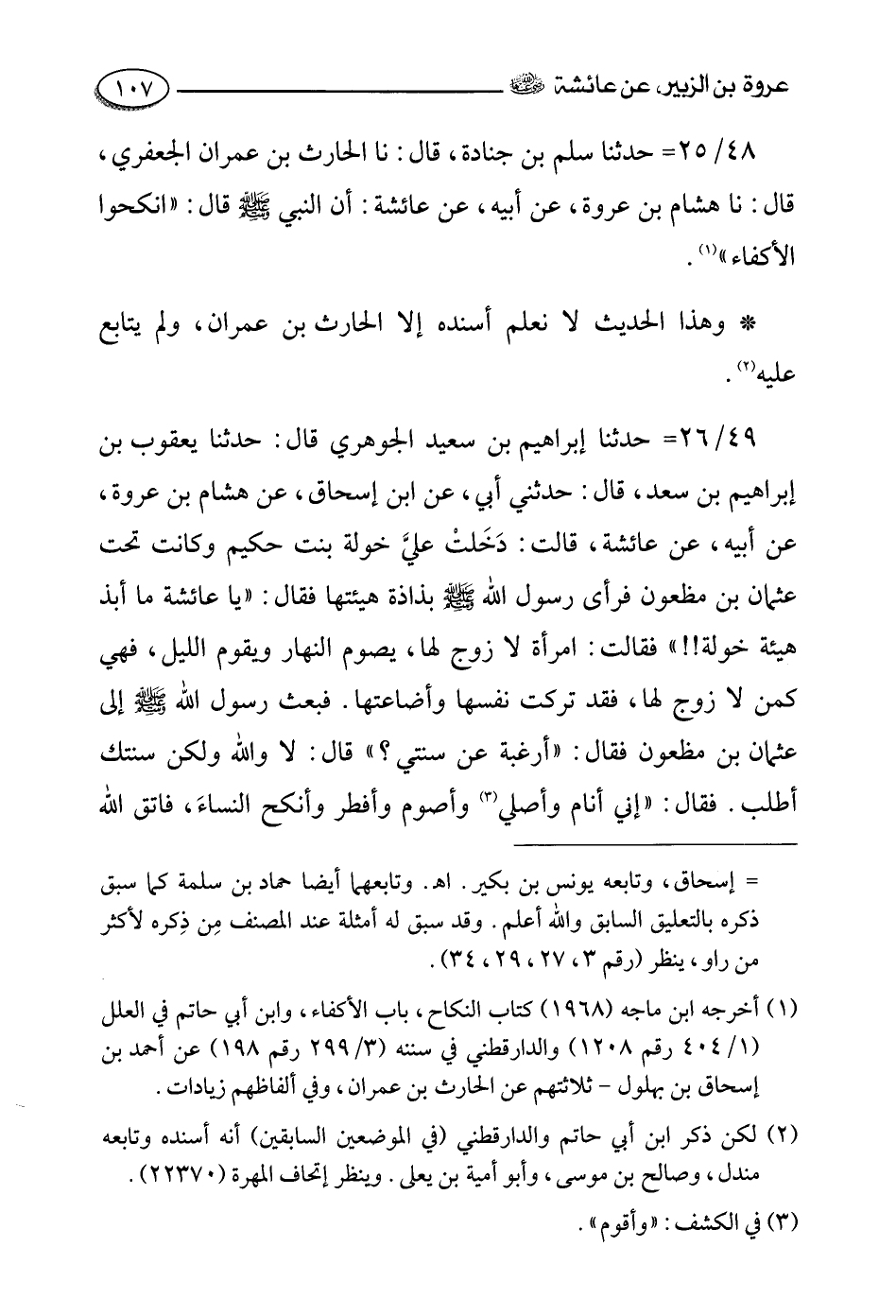 48- حدثنا سلم بن جنادة، قالَ: حَدَّثَنا الحارث بن عمران الجعفري، قالَ: حَدَّثَنا هشام بن عروة , عن أبيه , عن عائشة رضي الله عنها أَنَّ النَّبِيَّ صَلَّى اللَّهُ عَلَيْهِ وَسَلَّمَ قَالَ: انكحوا الأكفاء.