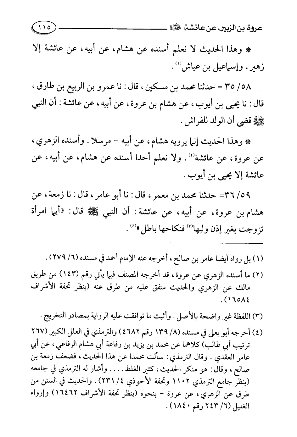 58- حدثنا محمد بن مسكين، قالَ: حَدَّثَنا عمرو بن الربيع بن طارق، قالَ: حَدَّثَنا يحيى بن أيوب , عن هشام بن عروة , عن أبيه , عن عائشة رضي الله عنها أن النبي صلى الله عليه وسلم قضى أن الولد للفراش.
