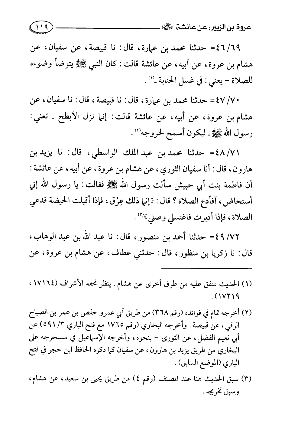 71- حدثنا محمد بن عبد الملك الواسطي، قالَ: حَدَّثَنا يزيد بن هارون قال: أخبرنا سفيان الثوري , عن هشام بن عروة , عن أبيه , عن عائشة رضي الله عنها أن فاطمة بنت أبي حبيش سَأَلْتَ رَسُولَ اللَّهِ صَلَّى اللَّهُ عَلَيْهِ وَسَلَّمَ فقالت: يا رسول الله إني استحاض أفأدع الصلاة؟ قال: إنما ذلك عرق فإذا أقبلت الحيضة فدعي الصلاة فإذا أدبرت فاغتسلي وصلي.