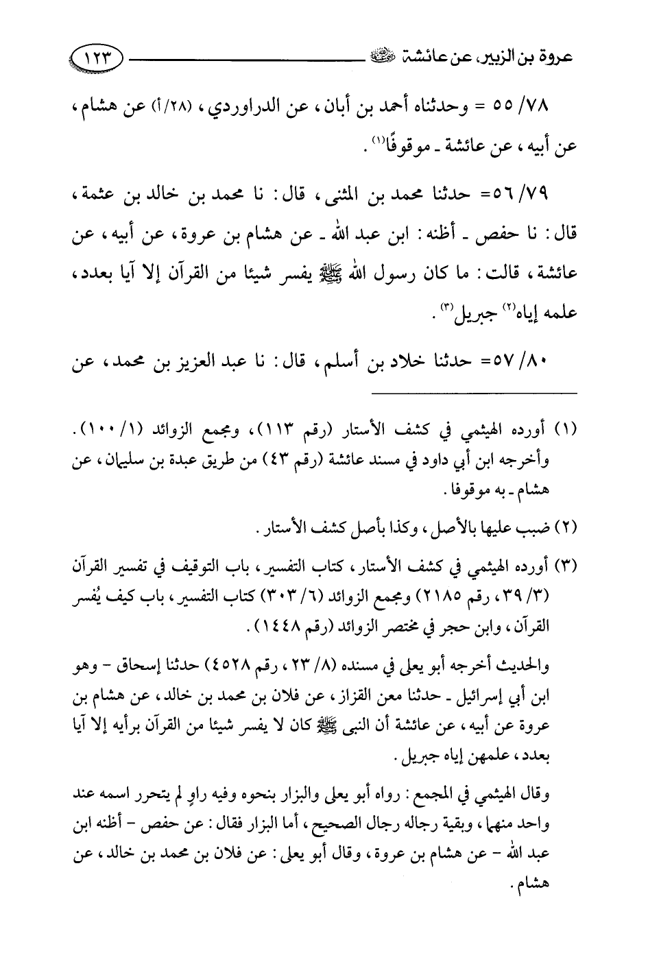 80- حدثنا خلاد بن أسلم، قالَ: حَدَّثَنا عبد العزيز بن محمد , عن هشام بن عروة , عن أبيه , عن عائشة رضي الله عنها.