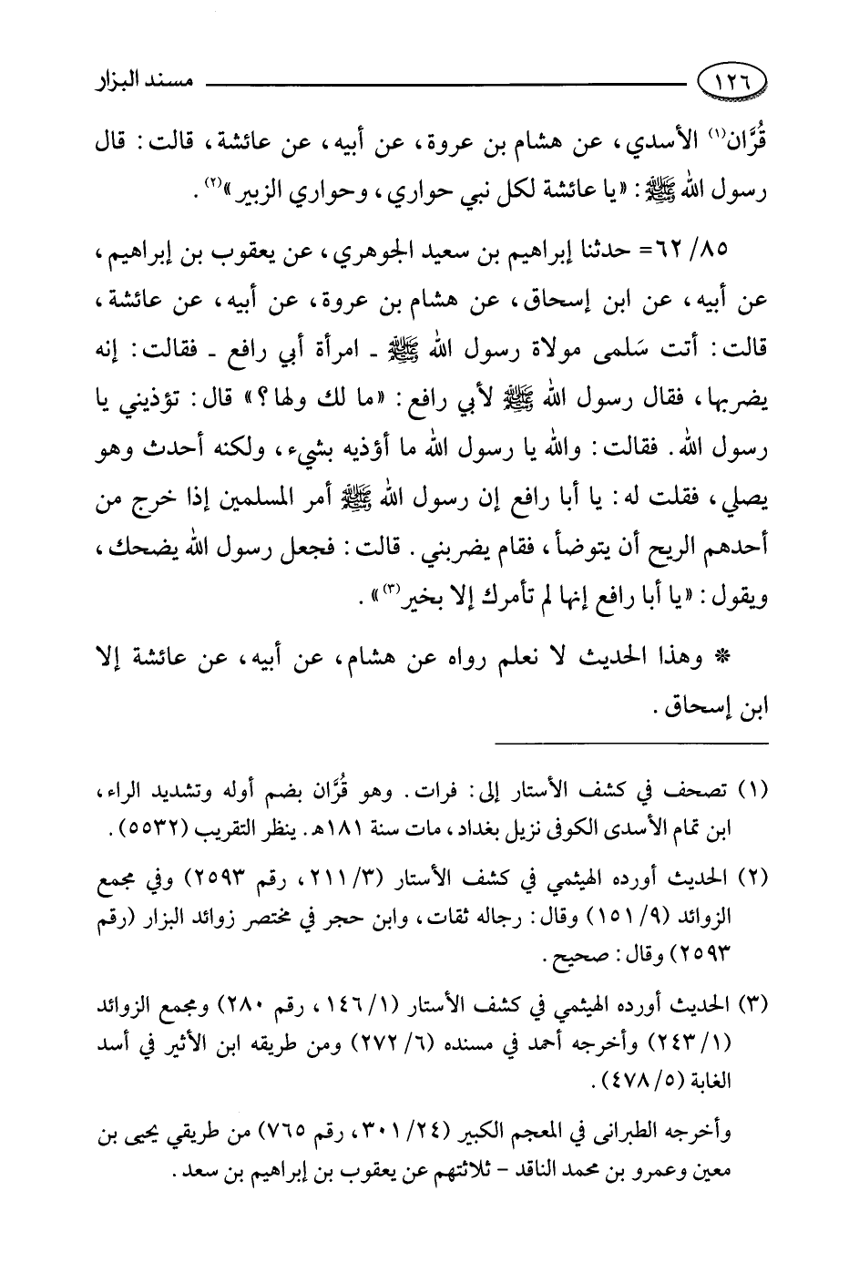 85- حدثنا إبراهيم بن سعيد الجوهري , عن يعقوب بن إبراهيم , عن أبيه , عن ابن إسحاق , عن هشام بن عروة , عن أبيه , عن عائشة رضي الله عنها قالت: أتت سلمى مولاة رسول الله صلى الله عليه وسلم امرأة أبي رافع فقالت إنه يضربها فَقَالَ رَسُولُ اللَّهِ صَلَّى اللَّهُ عَلَيْهِ وَسَلَّمَ لأبي رافع: ما لك ولها؟ ، قال: تؤذيني يا رسول الله. فقالت: والله يا رسول الله ما أؤذيه بشيء ولكنه أحدث وهو يصلي فقلت له: يا أبا رافع أَنَّ رَسُولَ اللَّهِ صَلَّى اللَّهُ عَلَيْهِ وَسَلَّمَ أمر المسلمين إذا خرج من أحدهم الريح أن يتوضأ فقام يضربني قالت: فجعل رسول الله يضحك ويقول: يا أبا رافع إنها لم تأمرك إلا بخير".