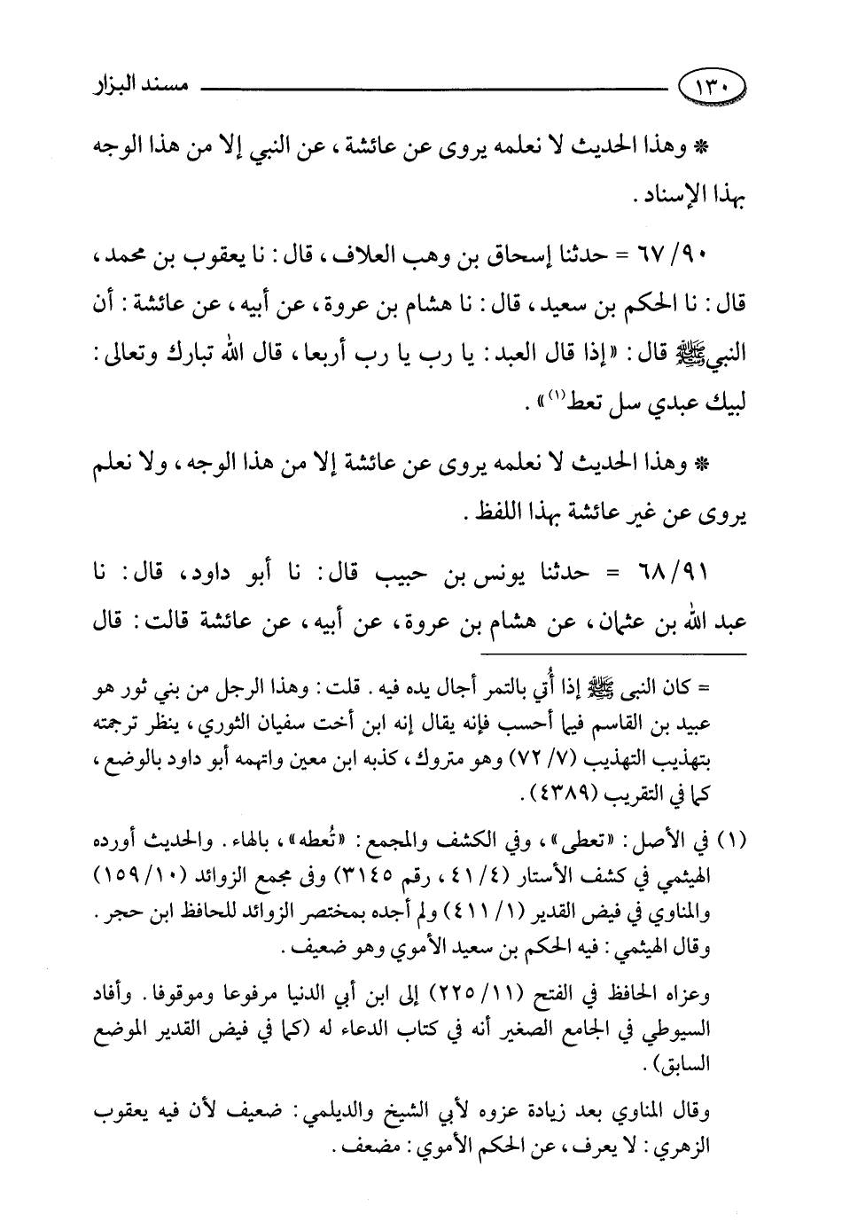 90- حدثنا إسحاق بن وهب العلاف، قالَ: حَدَّثَنا يعقوب بن محمد، قالَ: حَدَّثَنا الحكم بن سعيد، قالَ: حَدَّثَنا هشام بن عروة , عن أبيه , عن عائشة رضي الله عنها أَنَّ النَّبِيَّ صَلَّى اللَّهُ عَلَيْهِ وَسَلَّمَ قَالَ: إذا قال العبد يا رب يا رب أربعا قال الله تبارك وتعالى: لبيك عبدي سل تعط.