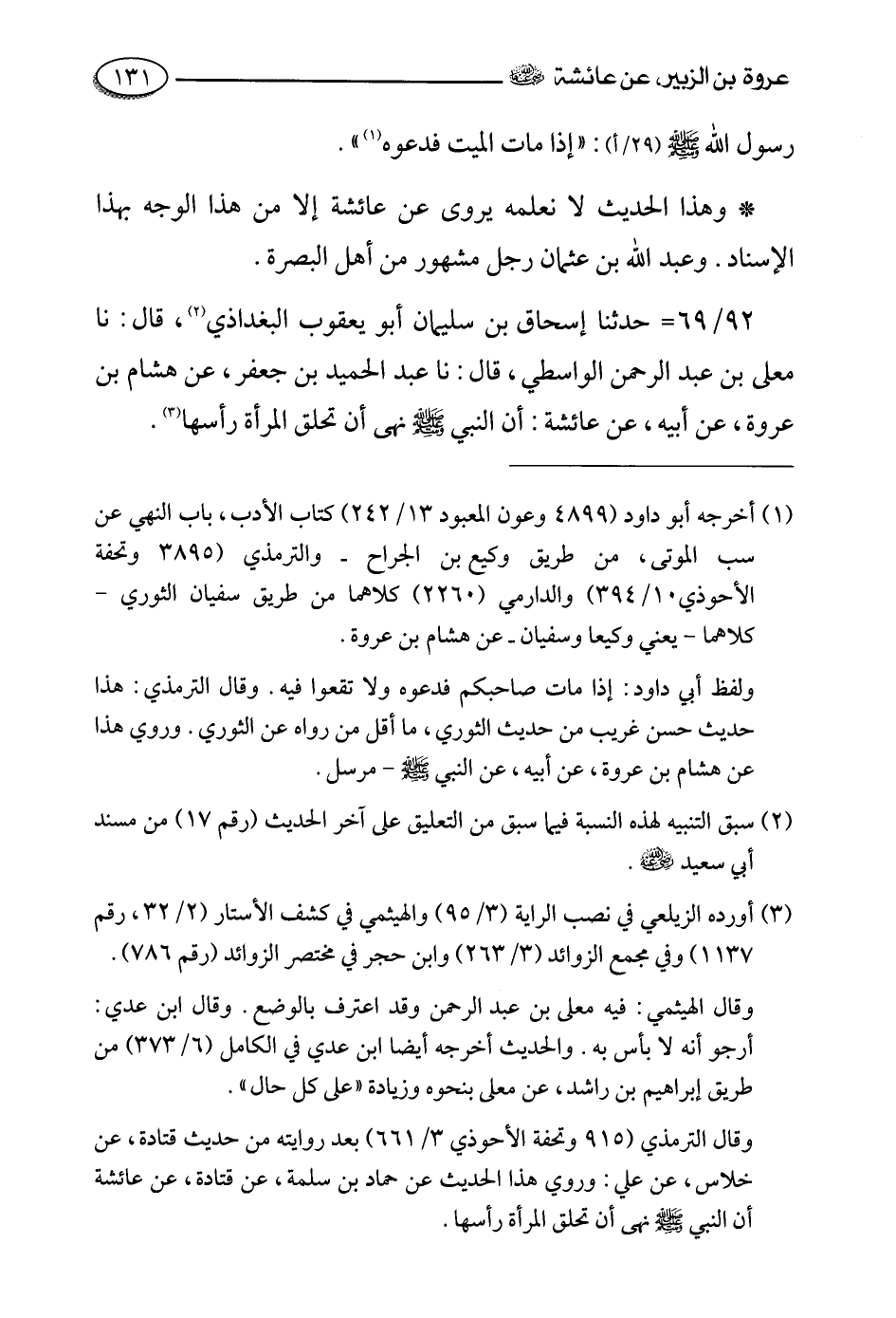 92- حدثنا إسحاق بن سليمان أبو يعقوب البغداذي، قالَ: حَدَّثَنا معلى بن عبد الرحمن الواسطي، قالَ: حَدَّثَنا عبد الحميد بن جعفر , عن هشام بن عروة , عن أبيه , عن عائشة رضي الله عنها أَنَّ النَّبِيَّ صَلَّى اللَّهُ عَلَيْهِ وَسَلَّمَ نَهَى أن تحلق المرأة رأسها.