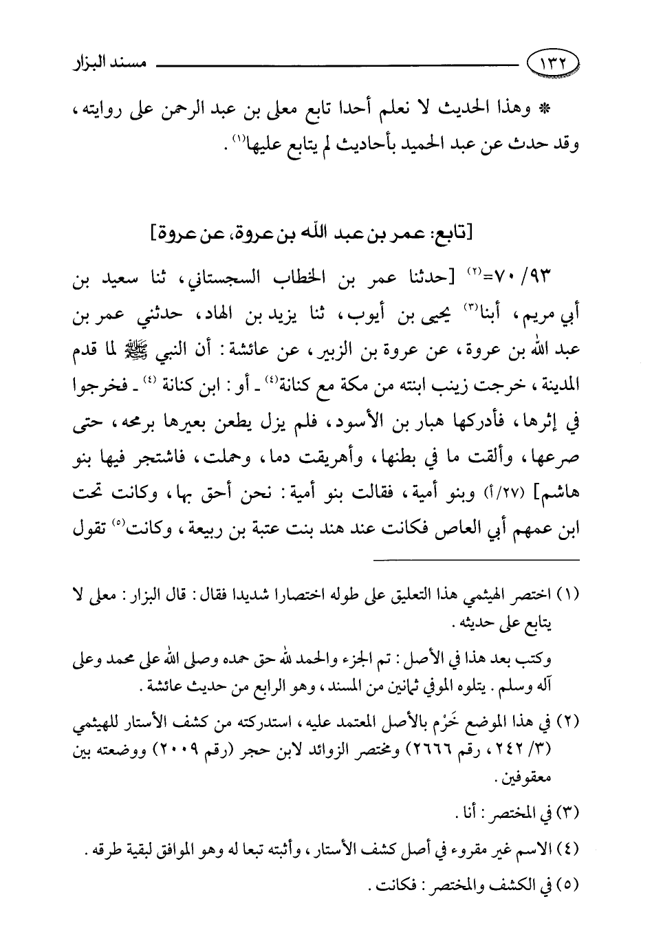 93-[حدثنا عمر بن الخطاب السجستاني حدثنا سعيد بن أبي مريم ابنا يحيى بن أيوب حدثنا يزيد بن الهاد حدثني عمر بن عبد الله بن عروة , عن عروة بن الزبير , عن عائشة رضي الله عنها أَنَّ النَّبِيَّ صَلَّى اللَّهُ عَلَيْهِ وَسَلَّمَ لَمَّا قدم المدينة خرجت زينب ابنته من مكة مع كنانة أو ابن كنانة فخرجوا في إثرها فأدركها هبار بن الأسود فلم يزل يطعن بعيرها برمحه حتى صرعها وألقت ما في بطنها وأهريقت دما وحملت فاشتجر فيها بنو هاشم] وبنو أمية فقالت بنو أمية: نحن أحق بها وكانت تحت ابن عمهم أبي العاص فكانت عند هند بنت عتبة بن ربيعة وكانت تقول لها هند: هذا في سبب أبيك