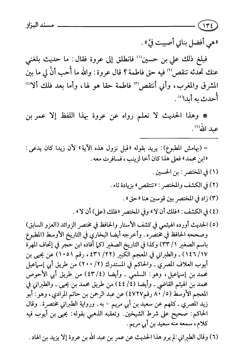 : هي أفضل بناتي أصيبت في، فبلغ ذلك علي بن حسين فانطلق إلى عروة فقال: ما حديث بلغني عنك تحدثه تنقص فيه حق فاطمة؟ قال عروة: والله ما أحب أن لي ما بين المشرق والمغرب وأني أنتقص فاطمة حقا هو لها وأما بعد فلك ألا أحدث به أَبَدًا.