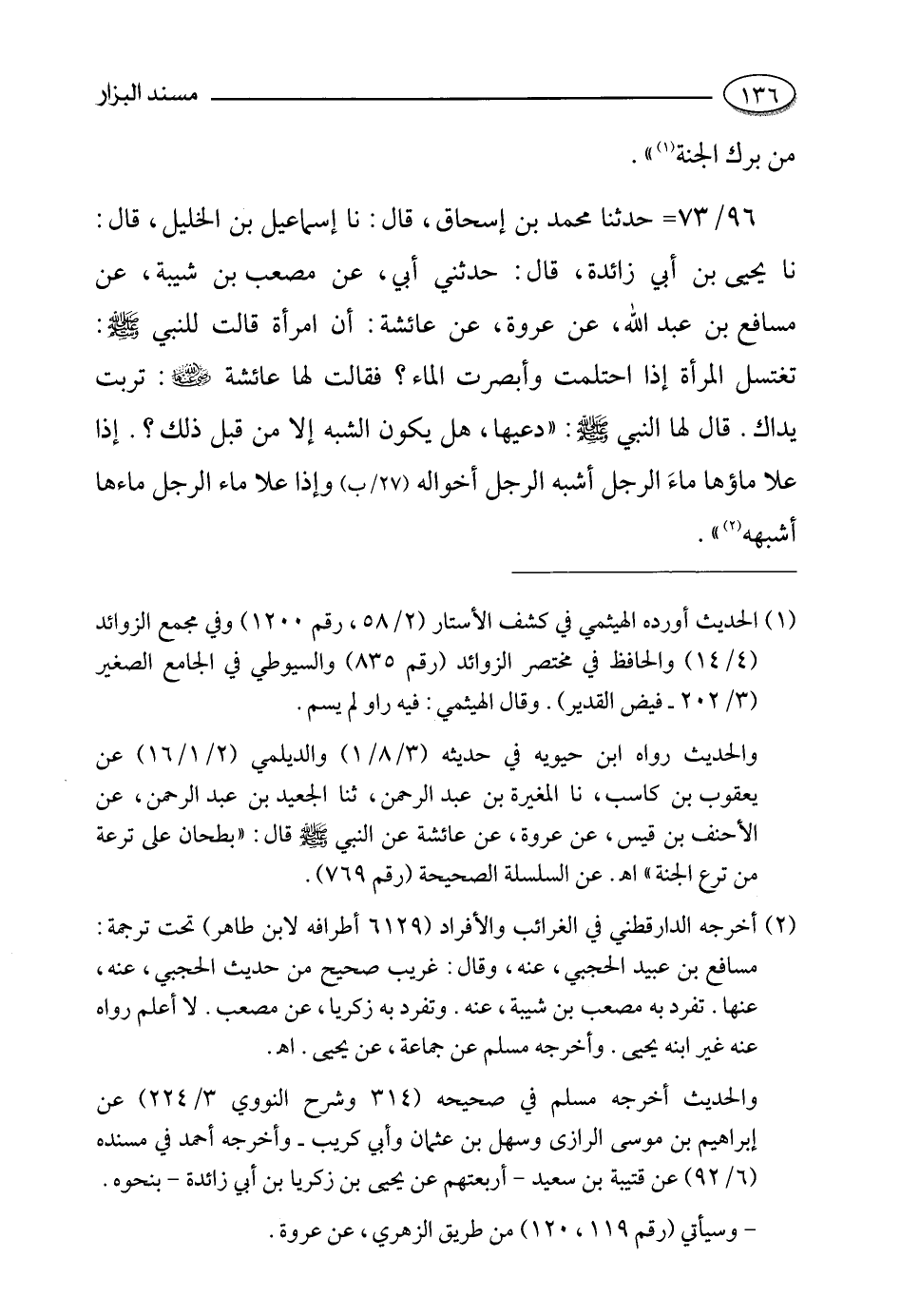 96- حدثنا محمد بن إسحاق، قالَ: حَدَّثَنا إسماعيل بن الخليل، قالَ: حَدَّثَنا يحيى بن أبي زائدة قال حدثني أبي , عن مصعب بن شيبة , عن مسافع بن عبد الله , عن عروة , عن عائشة رضي الله عنها أن امرأة قالت للنبي صلى الله عليه وسلم تغتسل المرأة إذا احتلمت وأبصرت الماء؟ فقالت لها عائشة رضي الله عنها تربت يداك. قال لها النبي صلى الله عليه وسلم "دعيها هل يكون الشبه إلا من قبل ذلك؟. إذا علا ماؤها ماء الرجل أشبه الرجل أخواله وإذا علا ماء الرجل ماءها أشبهه".
