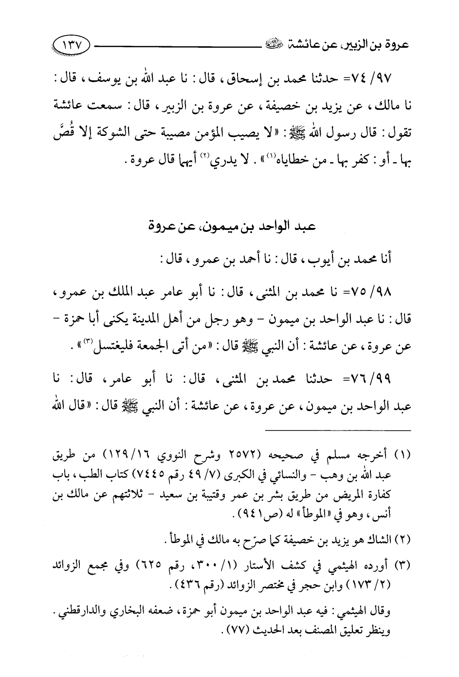 97- حدثنا محمد بن إسحاق، قالَ: حَدَّثَنا عبد الله بن يوسف، قالَ: حَدَّثَنا مالك , عن يزيد بن خصيفة , عن عروة بن الزبير قال سمعت عائشة تقول قَالَ رَسُولُ اللَّهِ صَلَّى اللَّهُ عَلَيْهِ وَسَلَّمَ: لا يصيب المؤمن مصيبة حتى الشوكة إلا قص بها أو كفر بها من خطاياه "لا يدري أيهما قال عروة.