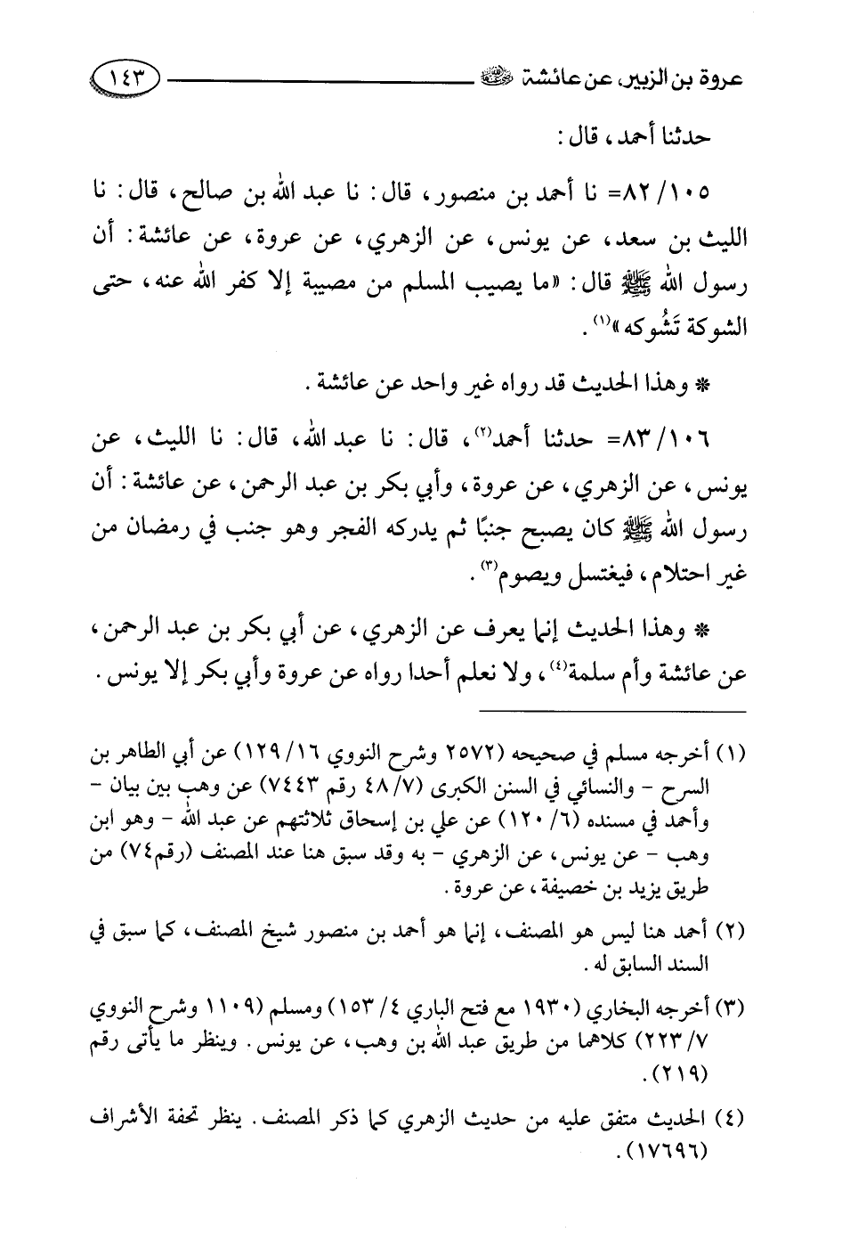 105- حدثنا أحمد بن منصور، قالَ: حَدَّثَنا عبد الله بن صالح، قالَ: حَدَّثَنا الليث بن سعد , عن يونس , عن الزهري , عن عروة , عن عائشة رضي الله عنها أَنَّ رَسُولَ اللَّهِ صَلَّى اللَّهُ عَلَيْهِ وَسَلَّمَ قال: ما يصيب المسلم من مصيبة إلا كفر الله عنه حتى الشوكة تشوكه.