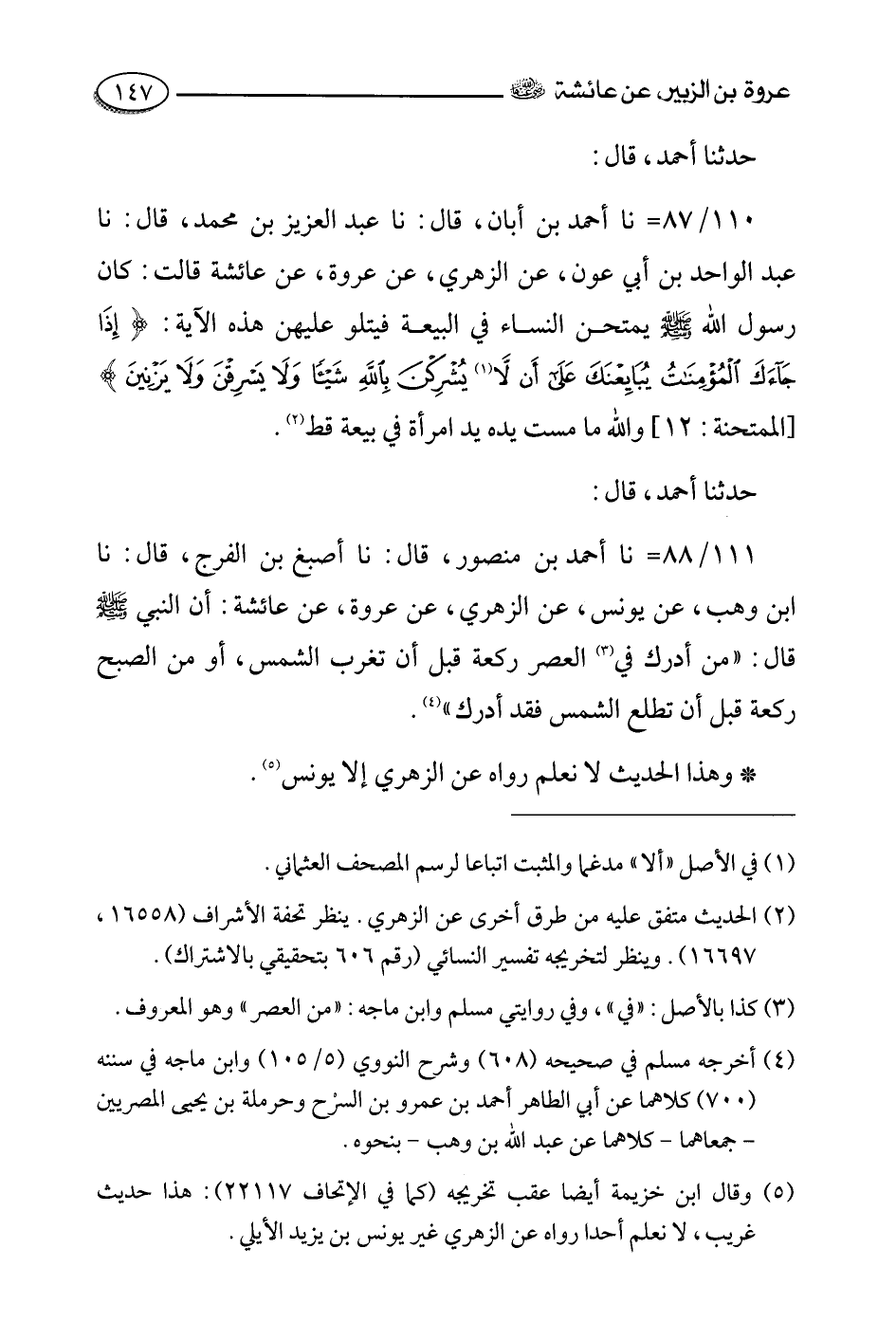 110- حدثنا أحمد بن أبان، قالَ: حَدَّثَنا عبد العزيز بن محمد، قالَ: حَدَّثَنا عبد الواحد بن أبي عون , عن الزهري , عن عروة , عن عائشة رضي الله عنها قالت: كَانَ رَسُولُ اللَّهِ صَلَّى اللَّهُ عَلَيْهِ وَسَلَّمَ يمتحن النساء في البيعة فيتلو عليهن هذه الآية {إذا جاءك المؤمنت يبايعنك على أن لا يشركن بالله شيئا ولا يسرقن ولا يزنين} والله ما مست يده يد امرأة في بيعة قط.