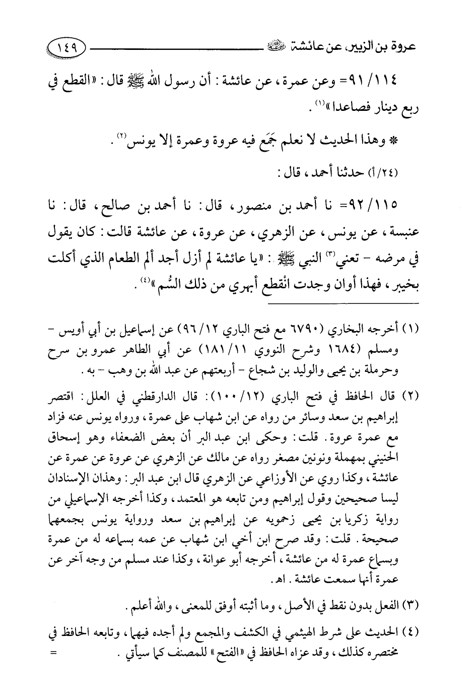 114- وعن عمرة , عن عائشة رضي الله عنها أَنَّ رَسُولَ اللَّهِ صَلَّى اللَّهُ عَلَيْهِ وَسَلَّمَ قال: القطع في ربع دينار فصاعدا.