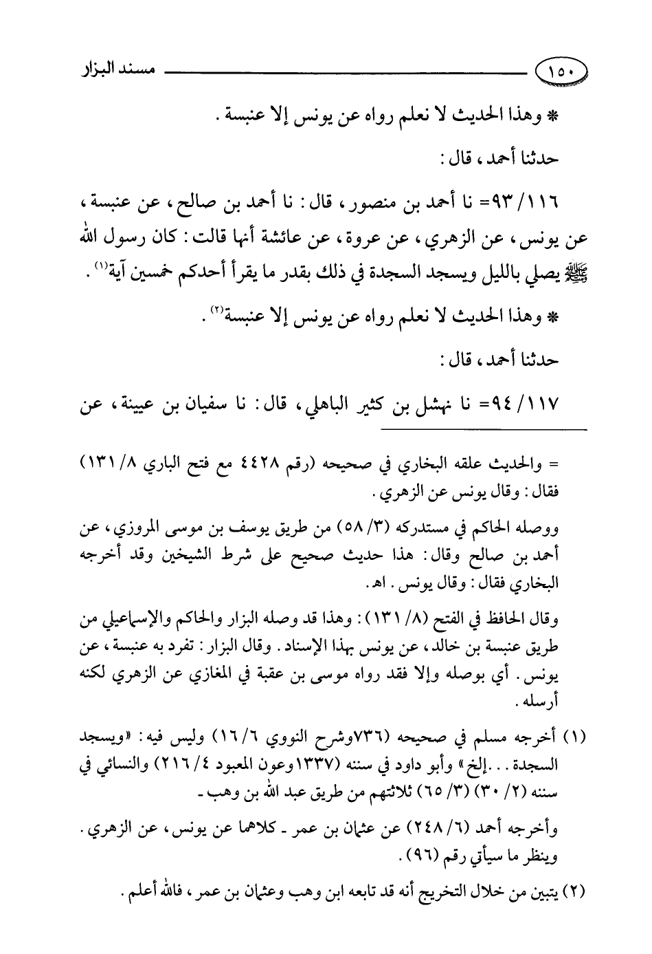 116- حدثنا أحمد بن منصور، قالَ: حَدَّثَنا أحمد بن صالح , عن عنبسة , عن يونس , عن الزهري , عن عروة , عن عائشة رضي الله عنها أنها قالت كَانَ رَسُولُ اللَّهِ صَلَّى اللَّهُ عَلَيْهِ وَسَلَّمَ يصلي بالليل ويسجد السجدة في ذلك بقدر ما يقرأ أحدكم خمسين آية.