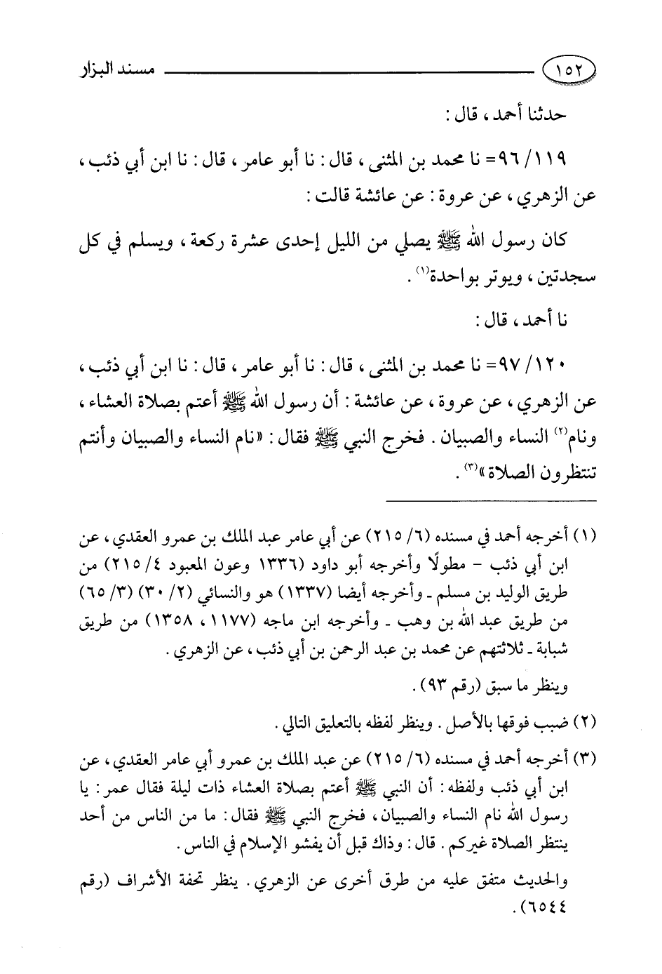 120- حدثنا محمد بن المثنى، قالَ: حَدَّثَنا أبو عامر، قالَ: حَدَّثَنا ابن أبي ذئب , عن الزهري , عن عروة , عن عائشة رضي الله عنها أَنَّ رَسُولَ اللَّهِ صَلَّى اللَّهُ عَلَيْهِ وَسَلَّمَ أعتم بصلاة العشاء ونام النساء والصبيان فخرج النبي صلى الله عليه وسلم فقال: نام النساء والصبيان وأنتم تنتظرون الصلاة".