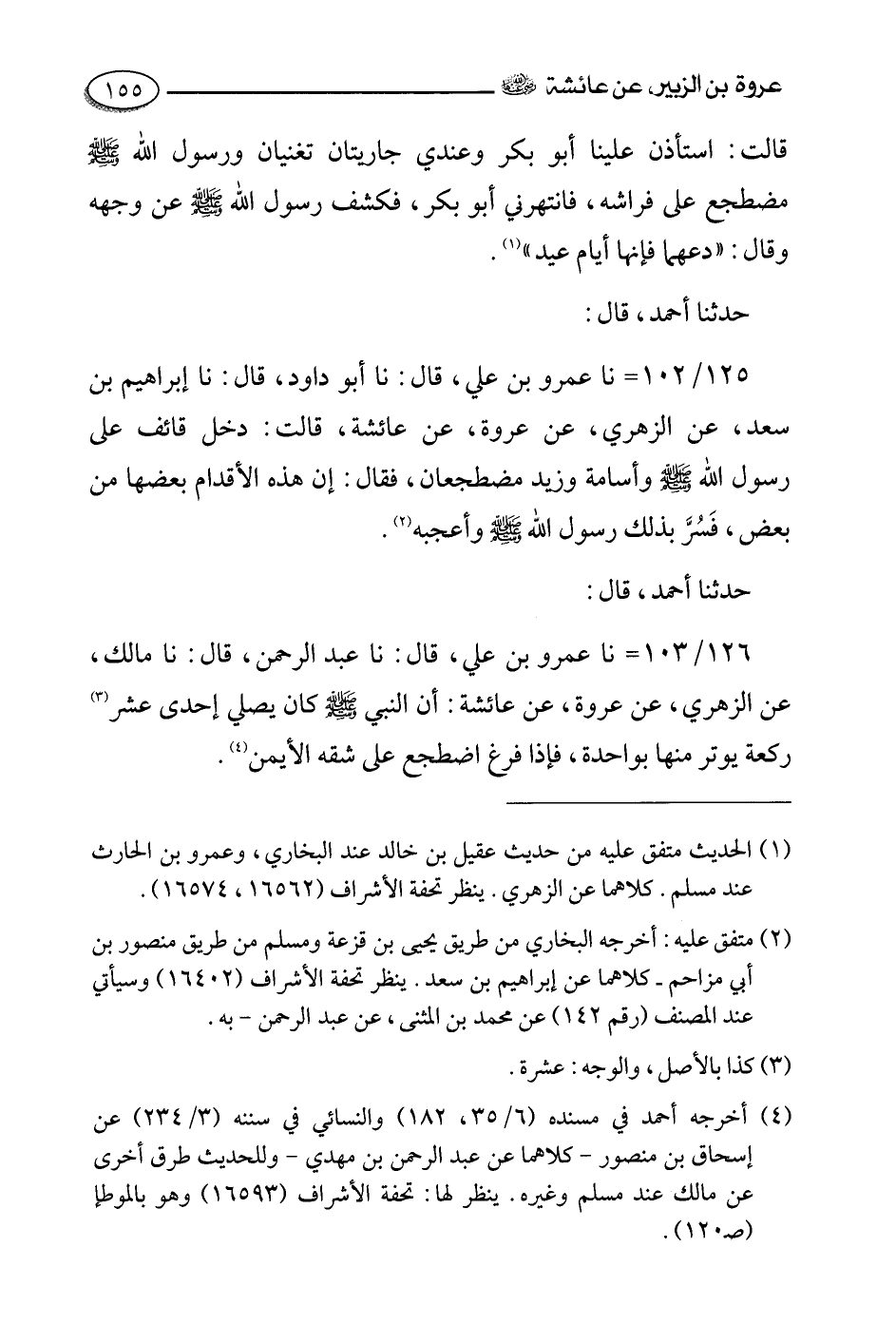 125- حدثنا عمرو بن علي، قالَ: حَدَّثَنا أبو داود، قالَ: حَدَّثَنا إبراهيم بن سعد , عن الزهري , عن عروة , عن عائشة رضي الله عنها قالت: دخل قائف عَلَى رَسُولِ اللَّهِ صَلَّى اللَّهُ عَلَيْهِ وَسَلَّمَ وأسامة وزيد مضطجعان فقال: إن هذه الأقدام بعضها من بعض فسر بذلك رسول الله صلى الله عليه وسلم وأعجبه.