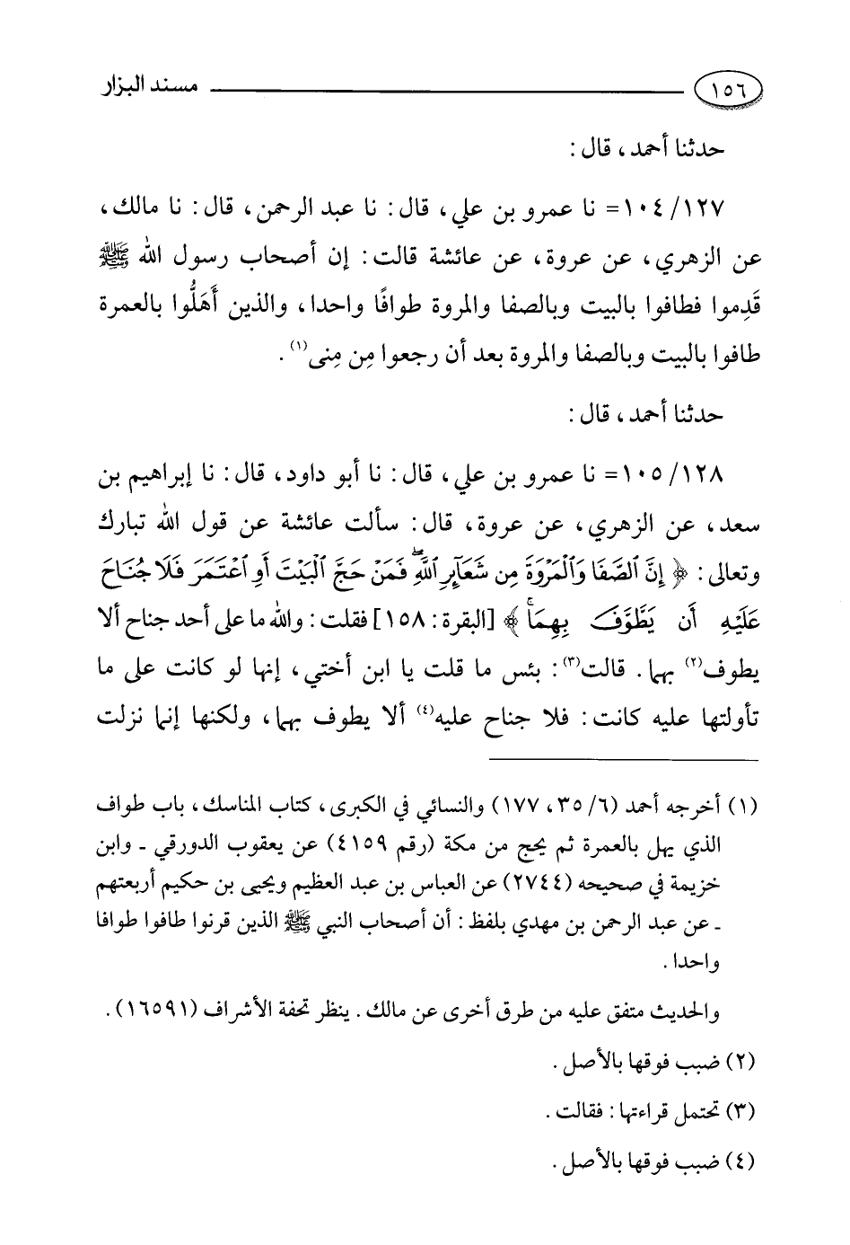 128- حدثنا عمرو بن علي، قالَ: حَدَّثَنا أبو داود، قالَ: حَدَّثَنا إبراهيم بن سعد , عن الزهري , عن عروة قال سألت عائشة من قول الله تبارك وتعالى {إن الصفا والمروة منا شَعَائِرِ اللَّهِ فَمَنْ حَجَّ الْبَيْتَ أَوِ اعْتَمَرَ فلا جناح عليه أن يطوف بهما} فقلت: والله ما على أحد جناح ألا يطوف بهما. قالت: بئس ما قلت يا ابن أختي إنها لو كانت على ما تأولتها عليه كانت: فلا جناح عليه ألا يطوف بهما ولكنها إنما نزلت والأنصار كانوا قبل أن يسلموا يهلوا لمناة الطاغية التي كانوا يعبدون عند البيت وكان من طاف بها يتحرج أن يطوف بالصفا والمروة فلما أسلموا سألوا , عن ذَلِكَ رَسُولَ اللَّهِ صَلَّى اللَّهُ عَلَيْهِ وَسَلَّمَ فقالوا: يا رسول الله إنا نتحرج أن , فنطوف (1) بالصفا والمروة فأنزل الله عز وجل {إِنَّ الصَّفَا وَالْمَرْوَةَ مِنْ شَعَائِرِ اللَّهِ فَمَنْ حَجَّ الْبَيْتَ أَوِ اعْتَمَرَ فَلا جُنَاحَ عَلَيْهِ أن يطوف بهما} قالت عائشة رضي الله عنها: قد سَنَّ رَسُولُ اللَّهِ صَلَّى اللَّهُ عَلَيْهِ وَسَلَّمَ الطواف فلا ينبغي لأحد أن يدع الطواف بهما.