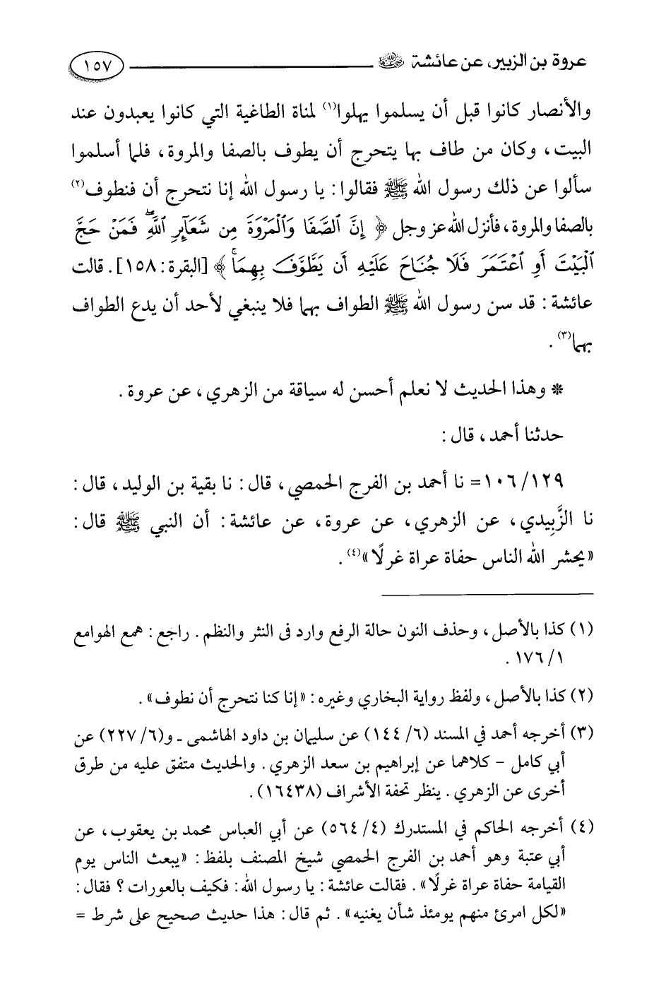 129- حدثنا أحمد بن الفرج الحمصي، قالَ: حَدَّثَنا بقية بن الوليد، قالَ: حَدَّثَنا الزبيدي , عن الزهري , عن عروة , عن عائشة رضي الله عنها أَنَّ النَّبِيَّ صَلَّى اللَّهُ عَلَيْهِ وَسَلَّمَ قَالَ: يحشر الله الناس حفاة عراة غرلا.