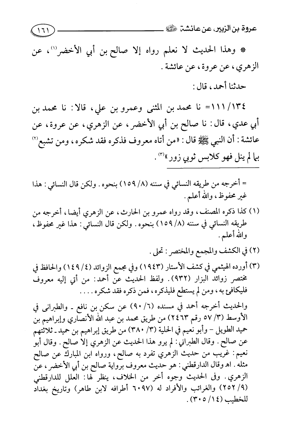 134- حَدَّثَنَا مُحَمَّدُ بْنُ الْمُثَنَّى وَعَمْرُو بْنُ عَلِيٍّ، قالاَ: حَدَّثَنا محمد بن أبي عدي، قالَ: حَدَّثَنا صَالِحُ بْنُ أَبِي الأَخْضَرِ , عَنِ الزُّهْرِيِّ , عَنْ عروة , عن عائشة رضي الله عنها أَنَّ النَّبِيَّ صَلَّى اللَّهُ عَلَيْهِ وَسَلَّمَ قَالَ: من أتاه معروف فذكره فقد شكره ومن تشبع بما لم ينل فهو كلابس ثوبي زور.